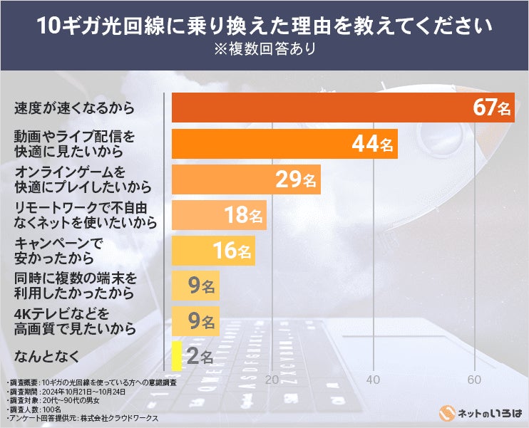 それ以外では「リモートワークで不自由なくネットを使いたいから」や「オンラインゲームを快適にプレイしたいから」と答えたユーザーも多かったです。2つとも「通信速度」が速いと改善できる内容となっており、実質「速度が速くなるから」と同じ理由と捉えられる結果となりました。