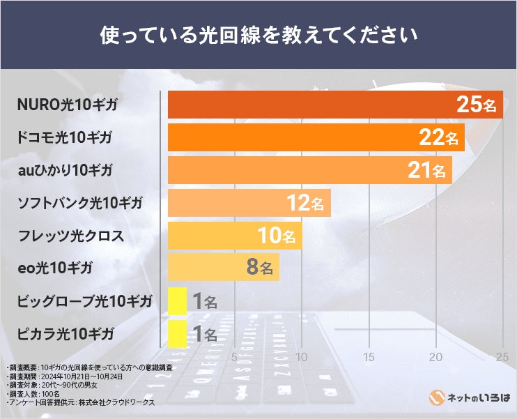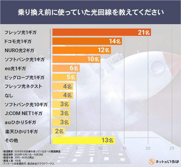 併せて乗り換え前に利用していた光回線も調査したところ、ほとんどのユーザーは1ギガ回線から10ギガ回線に乗り換えていることが分かりました。とくに多かったのがフレッツ光やドコモ光、ソフトバンク光などの大手光回線です。