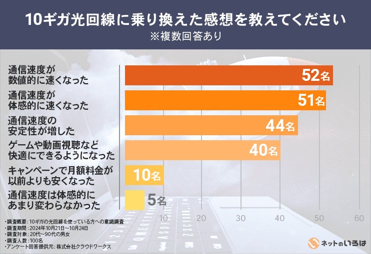 上記のとおり、通信速度にまつわるポジティブな回答が多かったです。体感的にあまり変わらなかったと回答したのはわずか2%で、10ギガ回線の速さがよく分かる結果となりました。