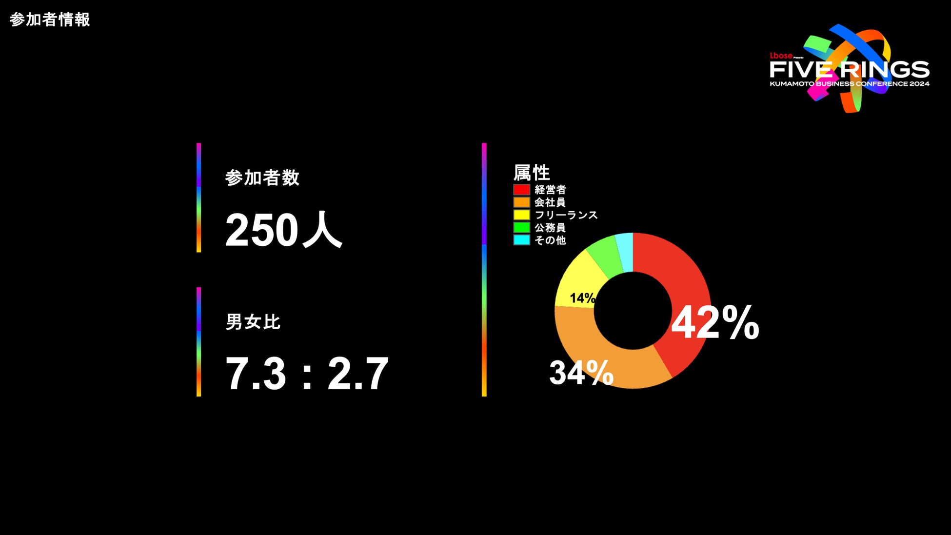 当日は250人に参加いただき、半数以上が経営者とフリーランス、男女比は73:27でした。