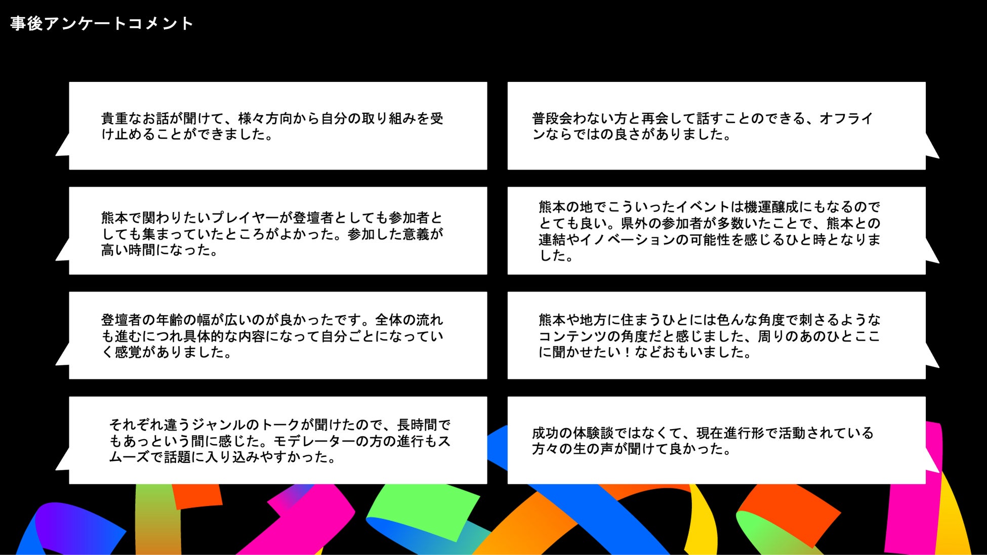 イベント後のアンケートでは、私たちが心がけていた点に関して多数のお褒めの言葉をいただきました。