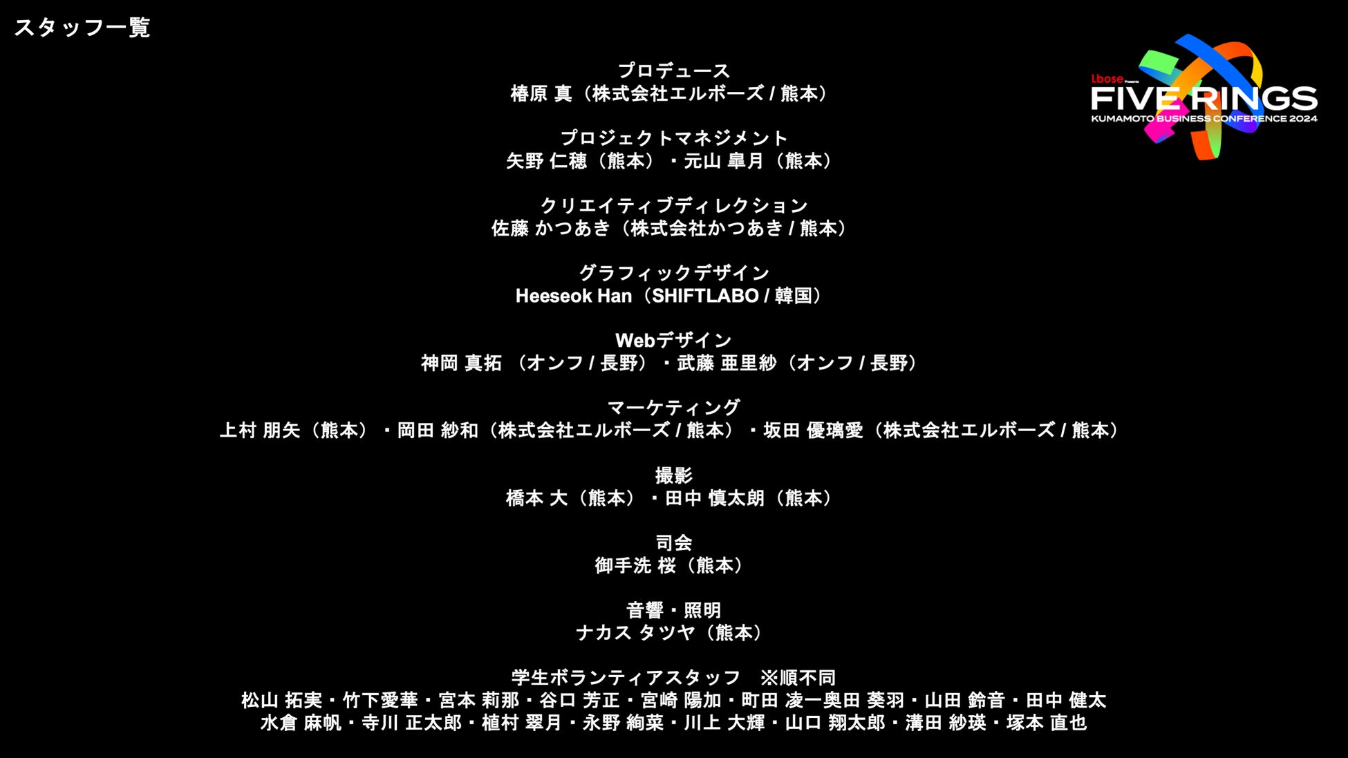 「"誰と、どこで、何をするか"を、もっと自由に。」をミッションにかかげ、企業のデジタルプロダクト開発支援を行う株式会社エルボーズ(本社:熊本県熊本市、代表取締役:小谷草志)は、3/5(火)に開催した熊本最大級のビジネスカンファレンス「FIVE RINGS」の開催報告書・レポート動画を公開しました