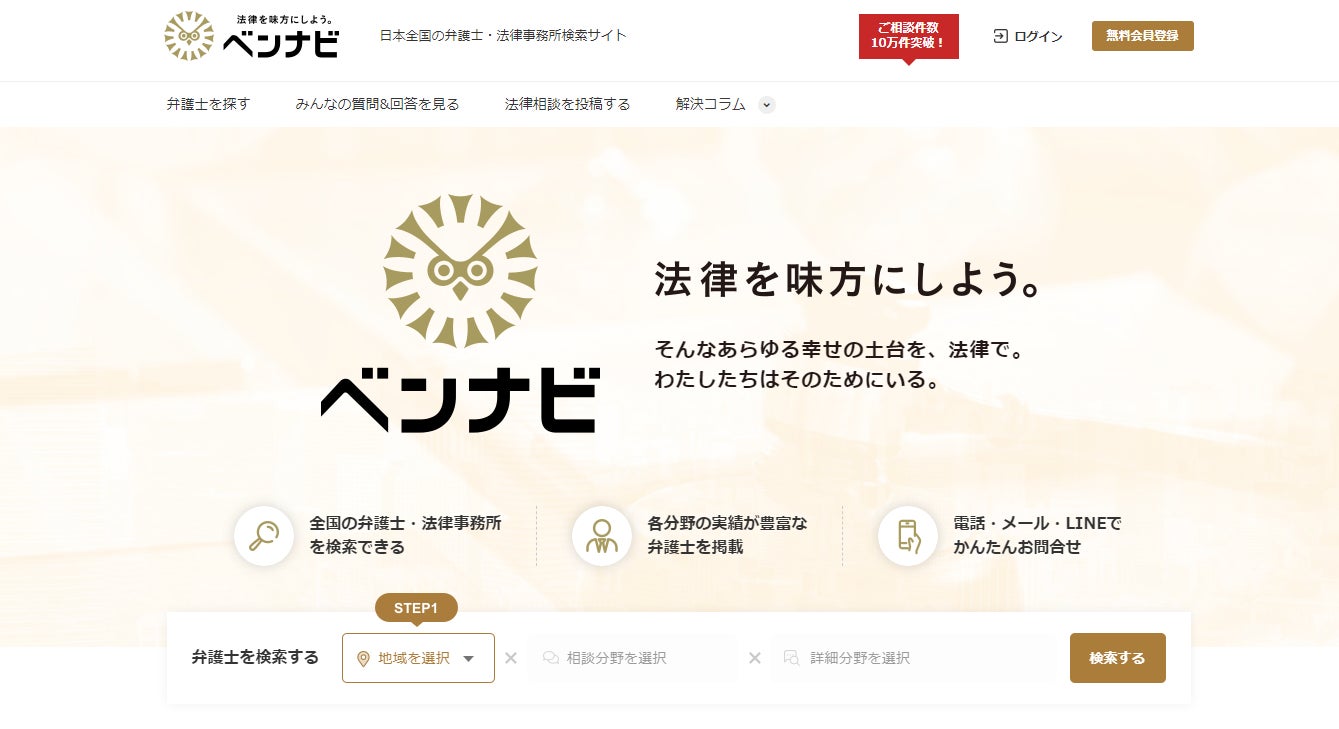 本サイトでは、「ベンナビ」ブランドの各事件分野に特化した9サイトを統合したサイトになっており、法律相談のジャンルを横断して法律トラブルの相談先を探すことや、無料相談QAとコラムの閲覧も可能です。