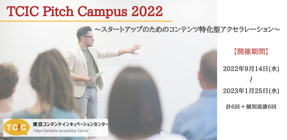 株式会社ツクリエ(本社:東京都千代田区、代表取締役:鈴木英樹)が東京都より運営受託をする、東京コンテンツインキュベーションセンター(以下、TCIC)は、コンテンツ関連事業のスタートアップを対象にした【コンテンツ事業向けピッチ特化型アクセラレーション】『TCIC Pitch Campus2022』のDemo Dayを1月25日(水)に開催しました。