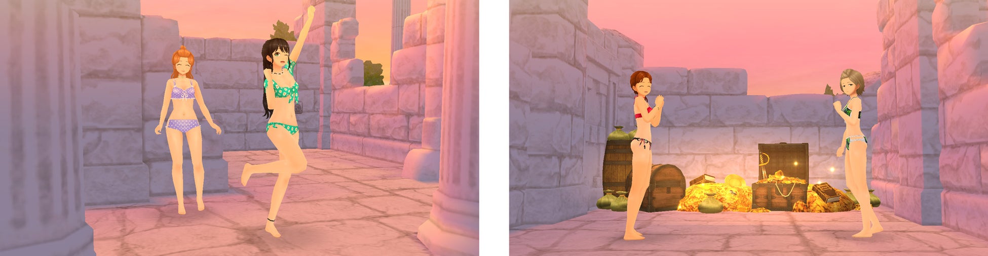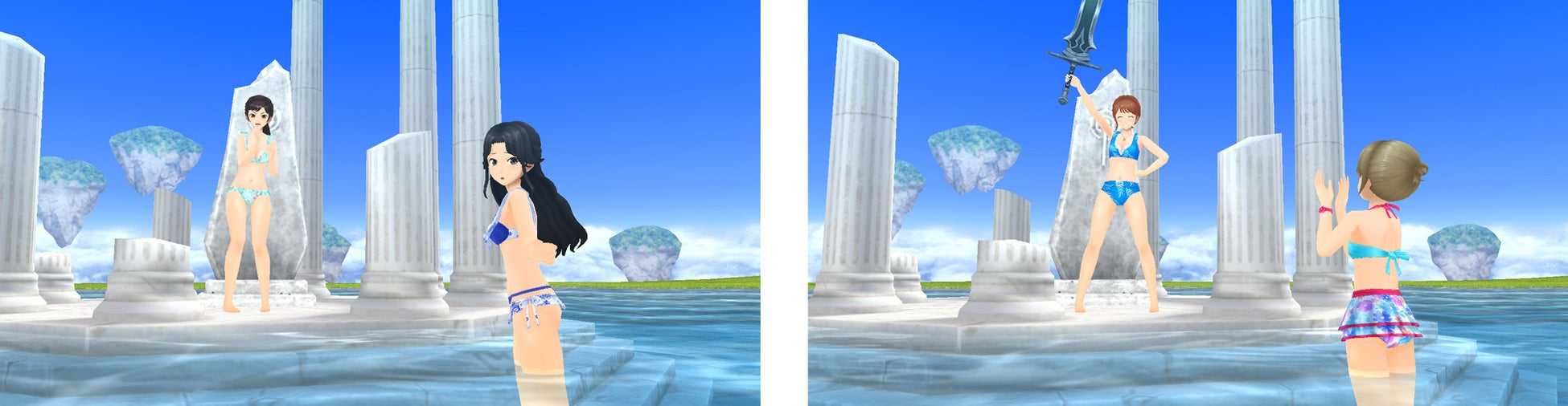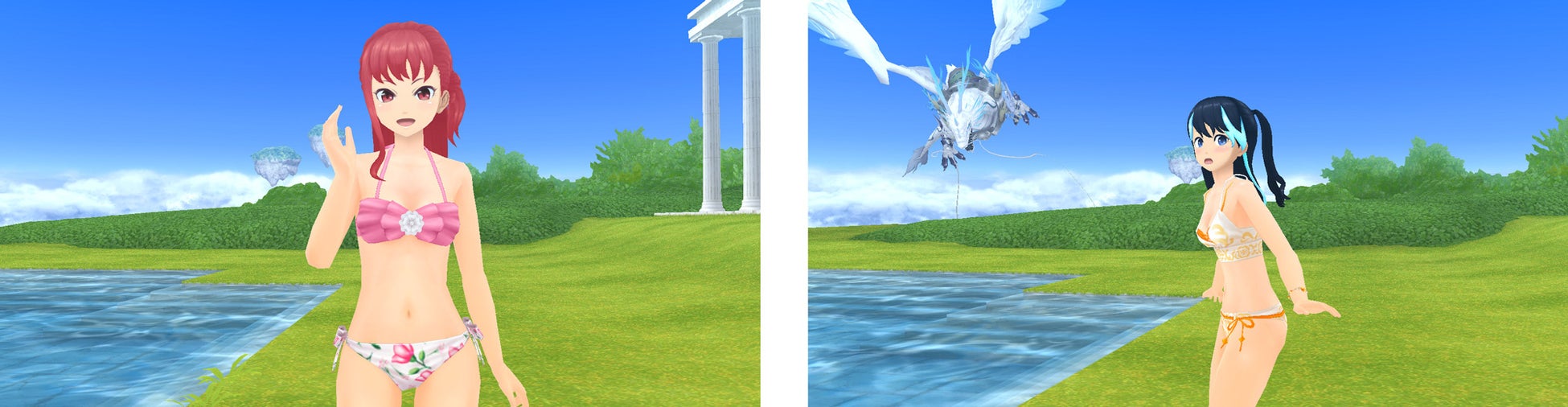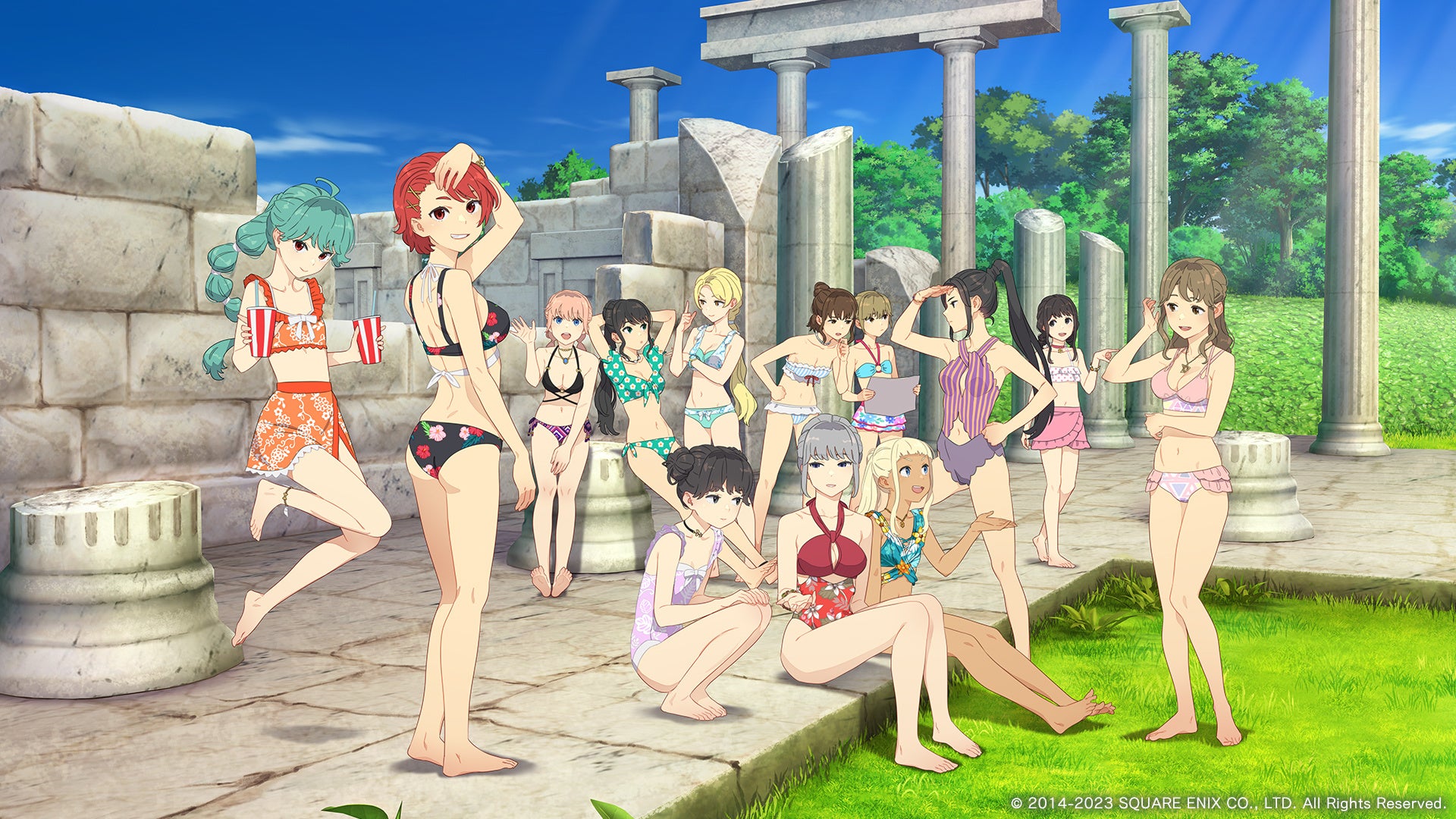 女の子たちが今年の新作水着を着用した、3 種類の「水着イラスト」を公開!女の子 38人それぞれが水着姿で夏を満喫する様子を見ることができます。幻想的な天空遺跡の背景にもご注目ください。