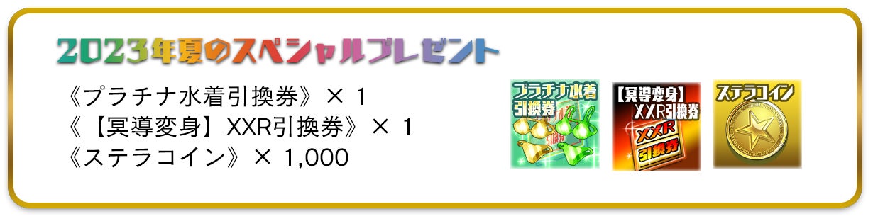 期間中 1 回限定で、ログインしたプレイヤー全員に、好きな女の子の《水着 2023》と交換ができる 「プラチナ水着引換券×1 枚」、最高レアリティの XXR メモカと引き換えできる「【冥導変身】XXR 引換券×1 枚」、「ステラコイン×1,000」をプレゼント!