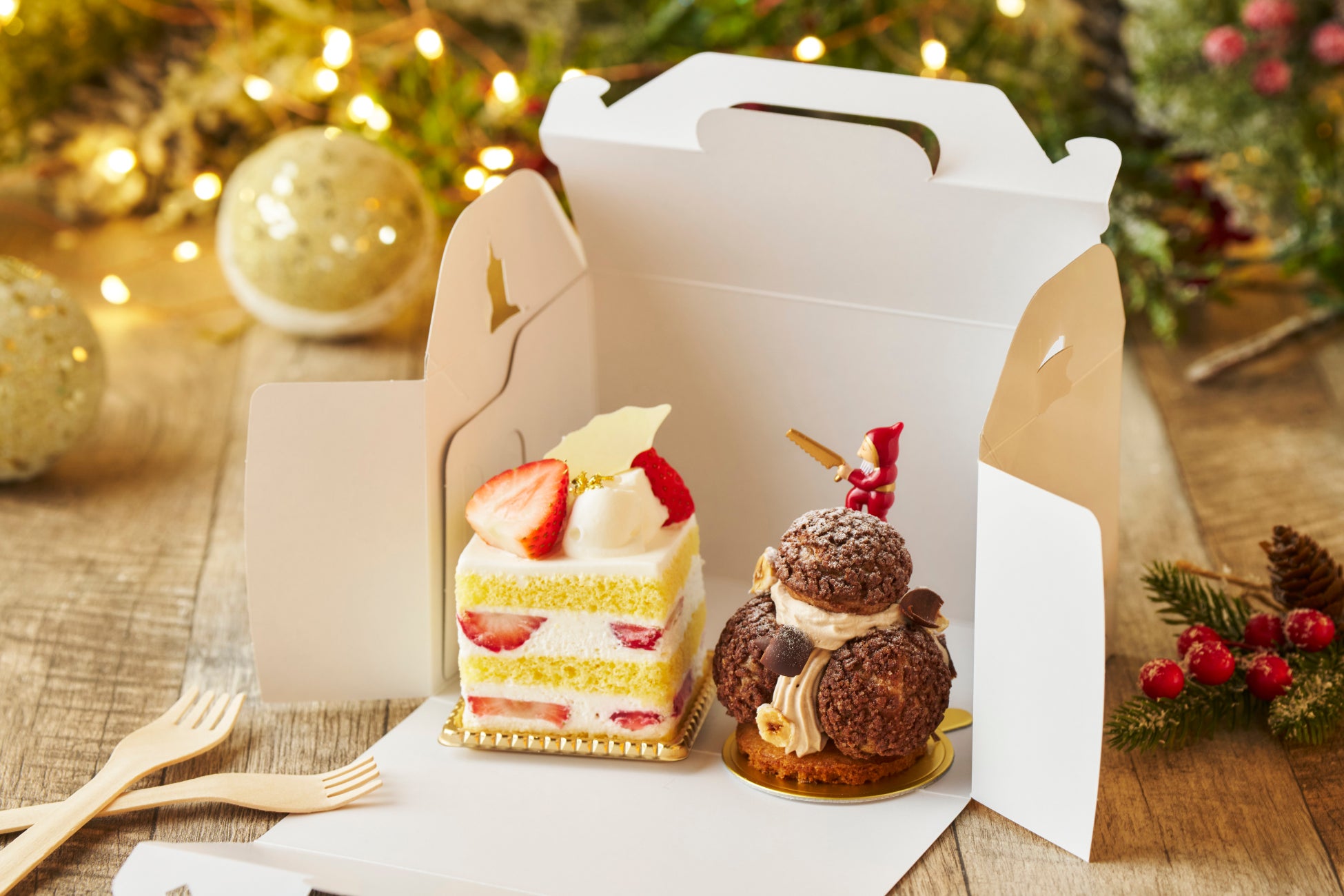 また、クリスマスイブとクリスマス当日となる12月24日(水)・25日(木)に限り、マーケットにてフェスティブケーキを販売いたします。お部屋でもお召し上がりいただけるサイズで、定番のストロベリーショートケーキとプラリネシューの2種セットを、数量限定でご用意いたします。