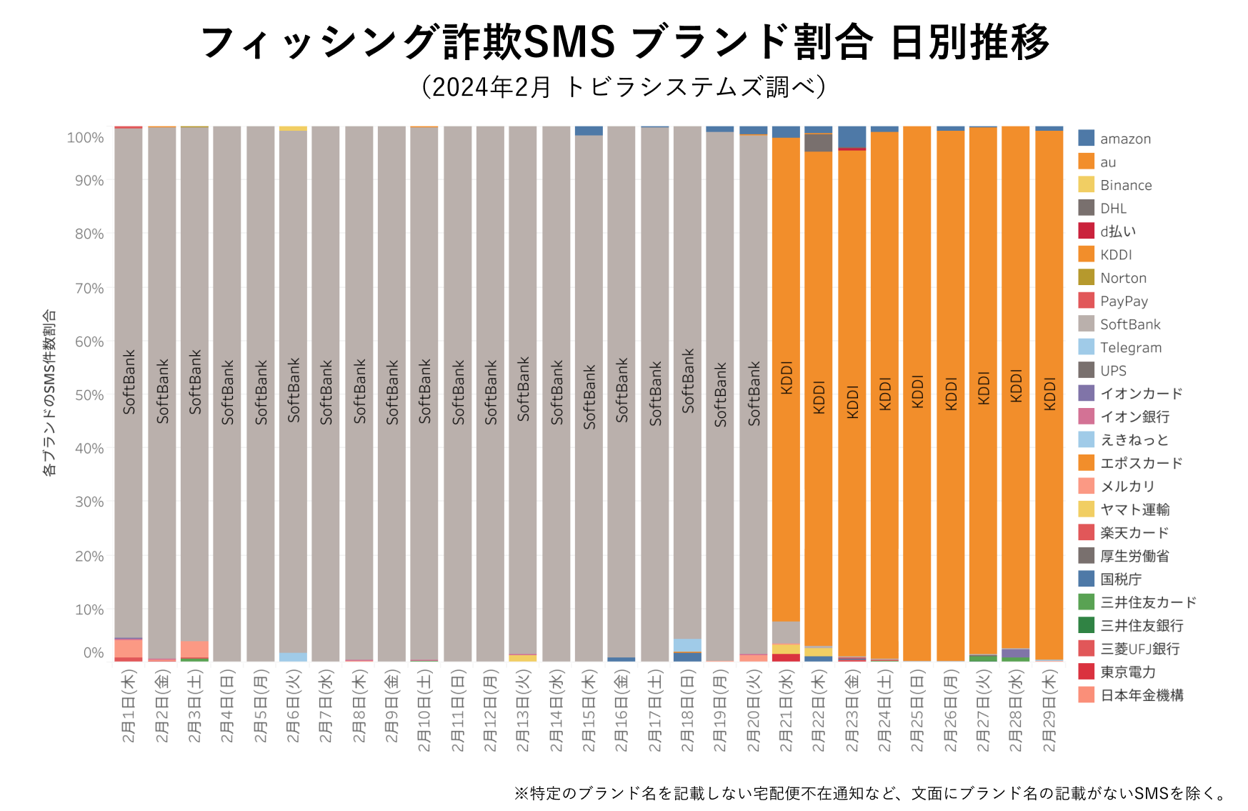 2024年2月は、通信事業者をかたる詐欺SMSの送信が活発化しました。実在する企業やブランドの名前をかたる詐欺SMSについて、2024年2月1日〜2月20日は「SoftBank」、2月21日〜2月29日は「KDDI」をかたる文面が目立ちました。