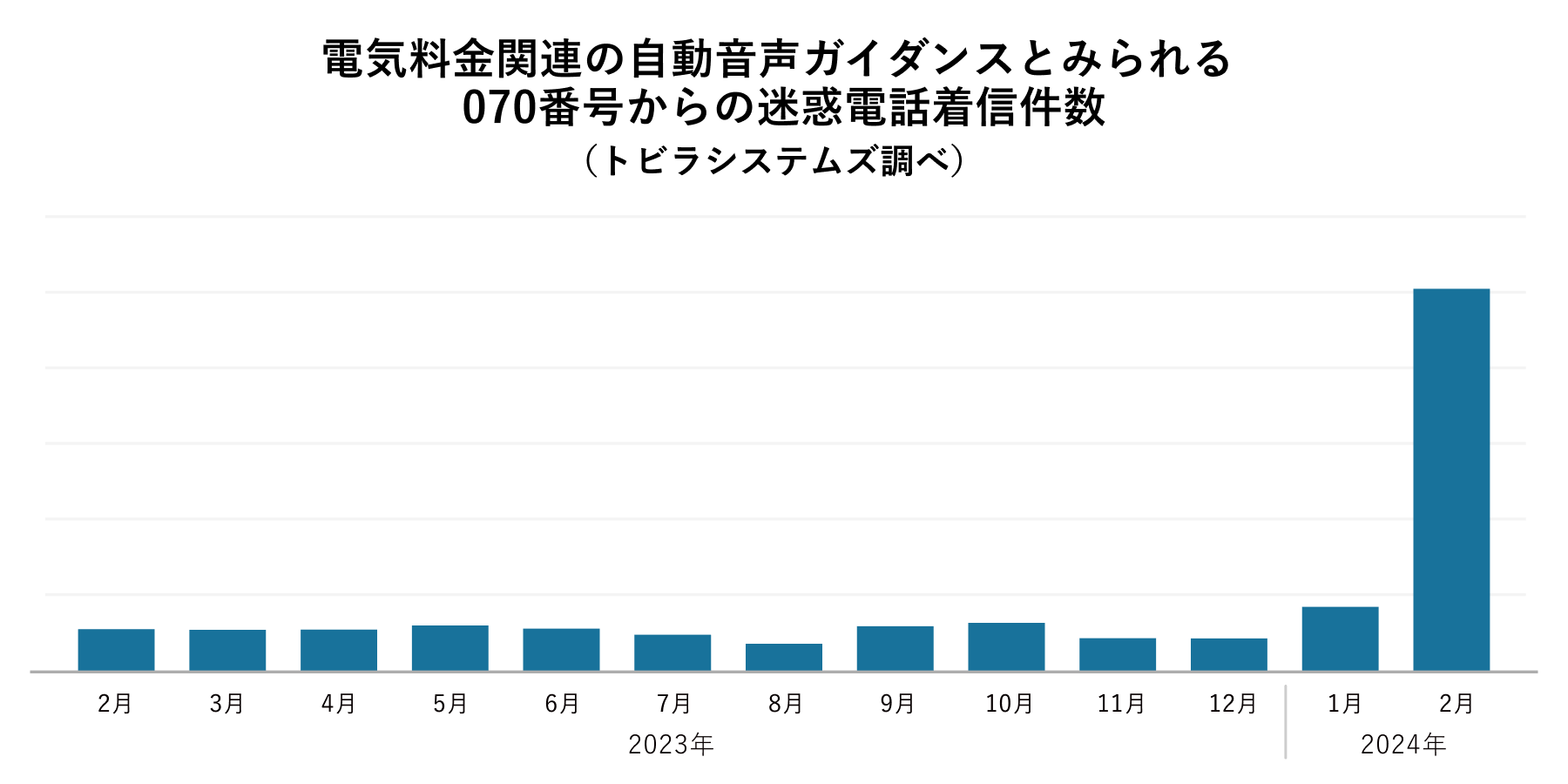 2024年2月は、070番号発信の電気料金に関する不審な自動音声ガイダンスの電話が急増しました。「電気料金の削減診断アンケート」などの名目で、「○歳以上か」「住居は一戸建てか」「同居家族の人数は」「電気代はいくらか」などの質問にダイヤルで回答を求める自動音声ガイダンスの電話が確認されています。