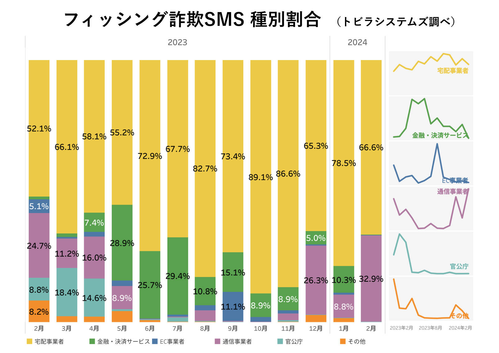 トビラシステムズの調査で、2024年2月に確認されたフィッシング詐欺のSMSの種別割合は、宅配事業者をかたる手口が66.6%、通信事業者をかたる手口が32.9%となりました。通信事業者をかたる手口の割合は前月比約4倍まで増加しました。