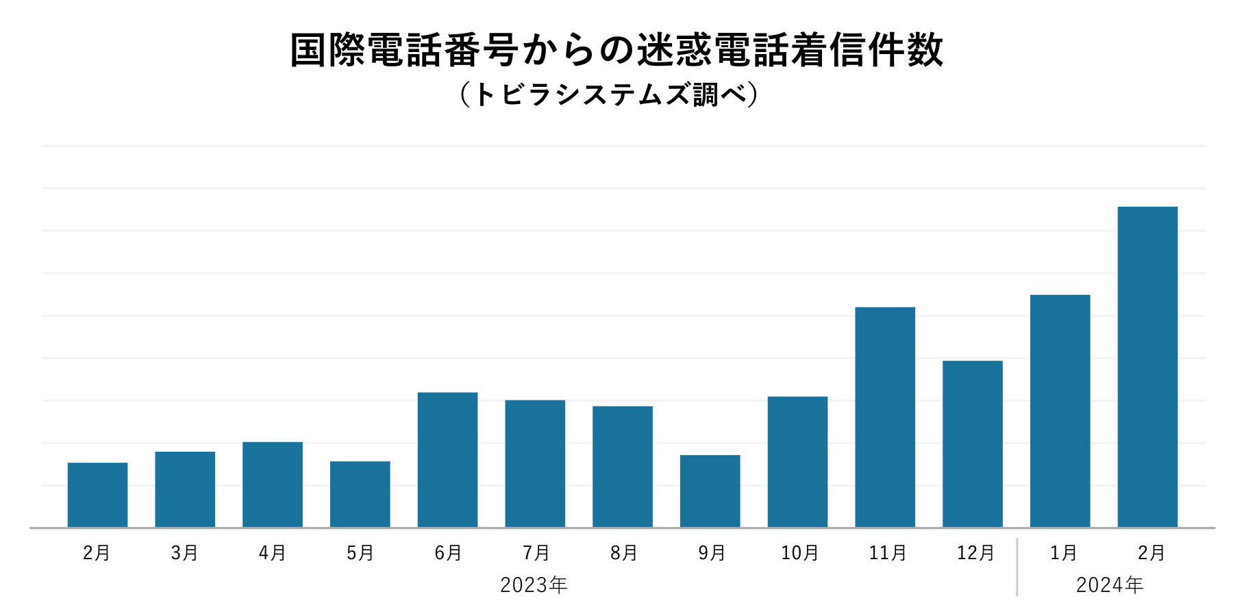 国際電話番号を利用した迷惑電話着信件数の増加が続いており、2024年2月は前年同期比で約5倍まで増加しました。