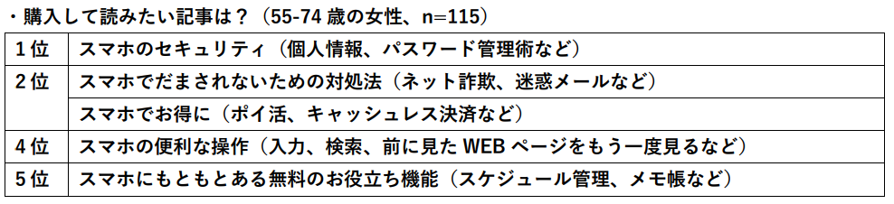「ハルメク」では毎年スマホ特集号をお届けしており、「ハルメク」編集部は特集の制作にあたり、ハルメク世代の女性にwebアンケート(55-74歳の女性、n=115、2023年3月14日~3月21日実施)とスマホ日記(55-82歳の女性、n=20、2023年3月13日~3月19日実施)による調査を行いました。その結果、スマホのセキュリティ&パスワード管理術、詐欺や迷惑メールの見分け方への関心が高い一方、ポイ活などのお得情報についても関心が高いことがわかりました。また、「スマホの便利な操作」や「無料のお役立ち機能」にも支持が集まりました。