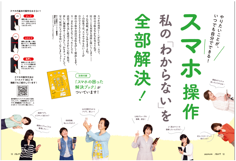 毎年大人気のハルメクのスマホ特集。今年は、よりパワーアップしてお届けします。スマホは、暮らしのさまざまな場面で、欠かせない道具となっています。それだけに、「これどうやるの?」「もっとスムーズにできたらいいのに」と操作にストレスを感じている人も多いのではないでしょうか?