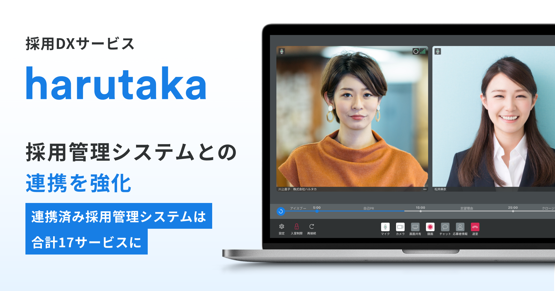 「harutaka」の主な機能である、面接担当者とWeb上でリアルタイムにやりとりをする『ライブ面接』、応募者が自身で動画撮影・投稿をする『エントリー動画』の2機能(※1)を各採用管理システム内でご利用頂けるようになります。