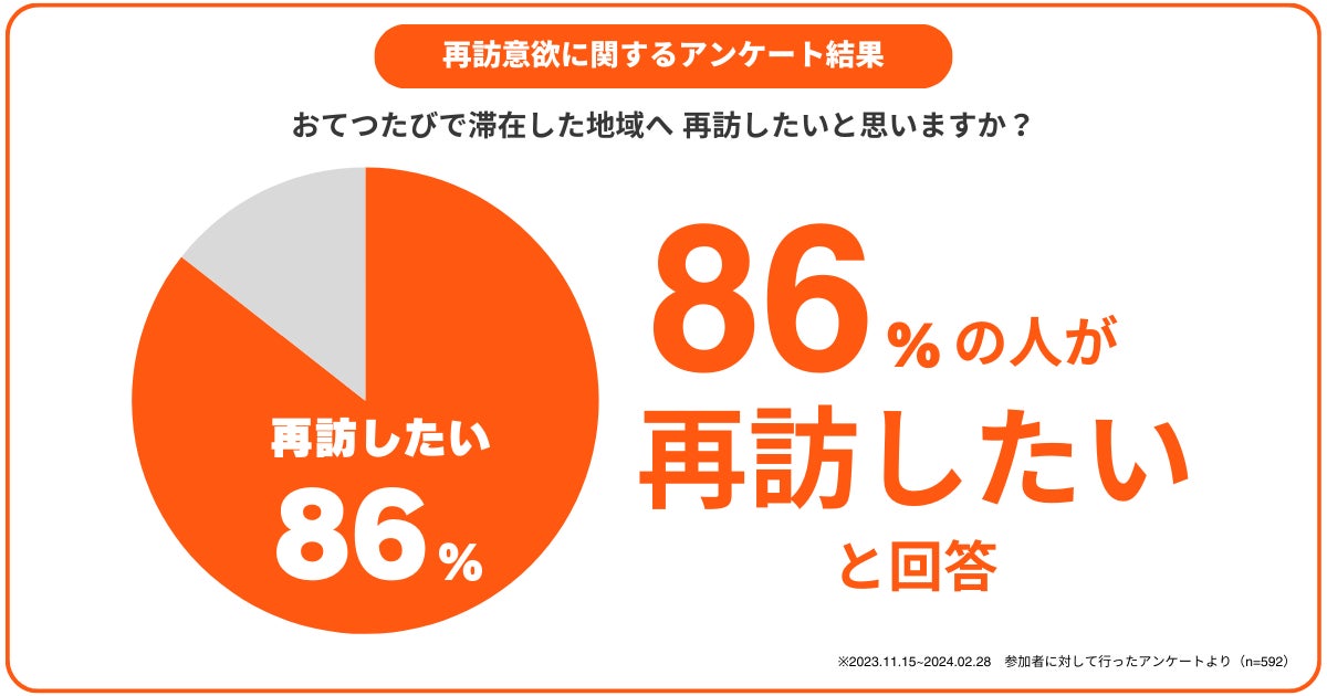 参加者の86%が「いずれ滞在地域を再訪したい」と回答。「おてつたび」を通じて、地域のファンが着実に増えています。