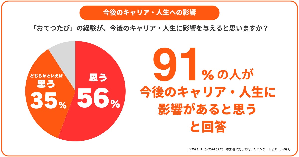 参加者の91%が「キャリアや人生に影響がある」と回答。おてつたびでの出会いが、誰かの人生の可能性を広げています。