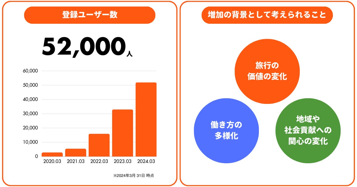 現在の登録ユーザー数は52,000人。従来の「旅行=娯楽」の概念を超え、「旅先で働くのも面白い」という価値観が広がりつつあります。