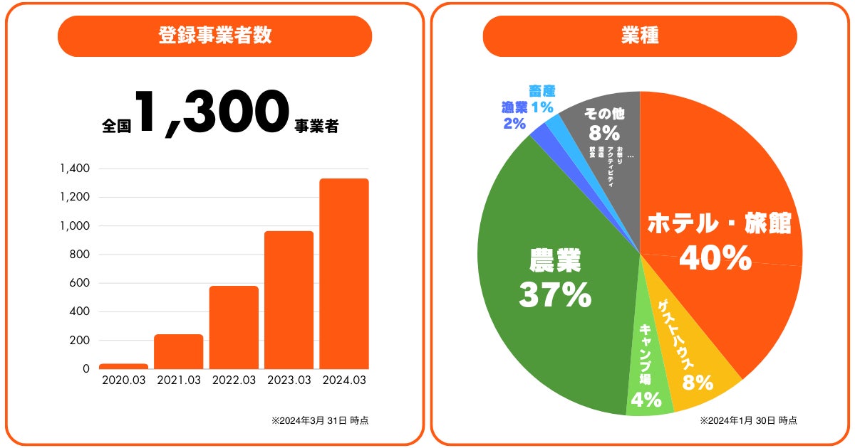 現在受け入れ先として全国1300以上の事業者が登録。観光需要増加を背景に人手不足が深刻化している「宿泊業」と、担い手不足が深刻化している「一次産業」が全体の8割ほどを占めます。