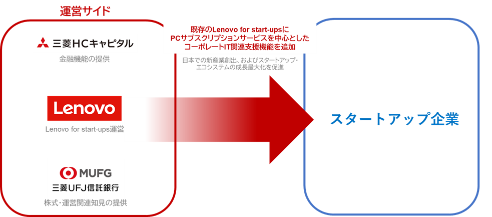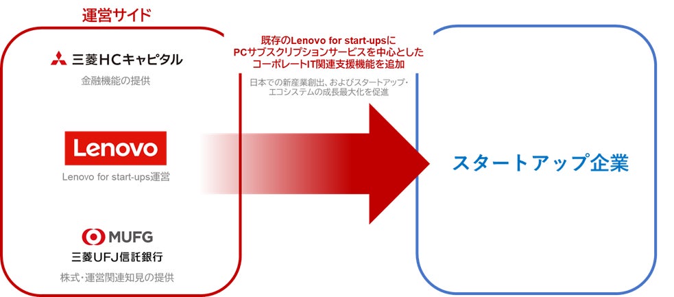 3社の強みを融合させ、まずは、「1stRound」に採択されたスタートアップ企業向けに、トライアルとしてPCサブスクリプションサービスを提供。これにより、PC機器1台からのサブスクリプション契約が可能となり、リソースが限定されるスタートアップ企業においても、最小限のリソース投下で自社のコーポレートIT体制の構築に着手することが可能となります。将来的には、さらなるスタートアップ企業への成長支援機能として、経理、人事、経営管理等のコーポレート機能のオールインワンパッケージでの提供もめざします。東大IPC関連のスタートアップ企業のみならず、その他のスタートアップ企業、一般中小企業向けに、その対象を拡大することも検討しています。本提携を通じて、レノボ、三菱UFJ信託銀行および三菱HCキャピタルは、スタートアップ企業における経営管理業務の効率化、主要業務への経営資源集中をサポート、そのさらなる成長に貢献してまいります。