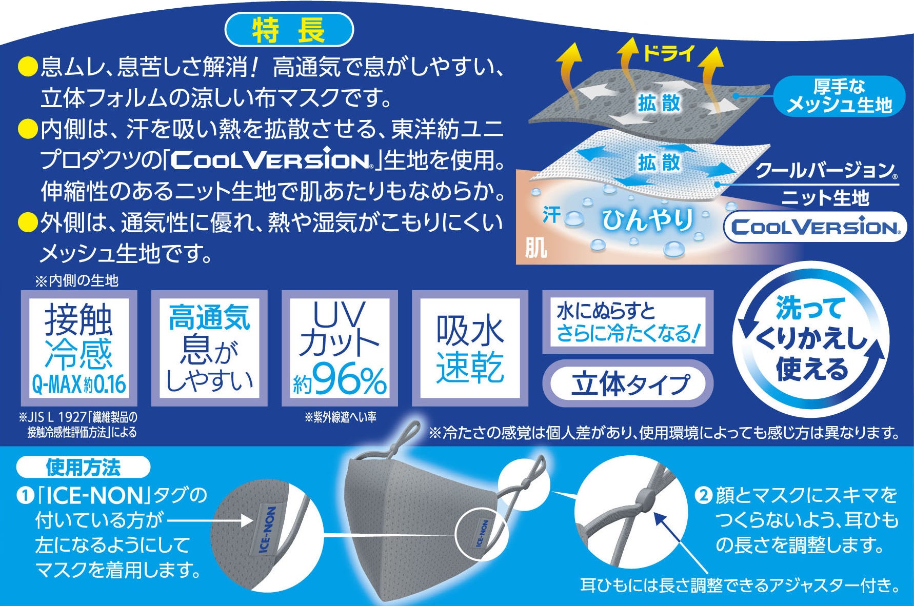 『アイスノン 冷涼感マスク』は、高通気で息がしやすい、立体フォルムの涼しい布マスクです。内側は、接触冷感、吸水速乾機能のある東洋紡ユニプロダクツの“COOL VERSION®”生地を採用。汗を吸い熱を拡散させることでひんやりした使用感です。外側は、熱や湿気がこもりにくいメッシュ生地で通気性抜群です。また、水にぬらすとさらに冷たくなるため、暑い季節に最適な布マスクです。布マスクユーザーが不織布マスク使用時に不満に感じる「息苦しさ」を解消できるマスクとして好評をいただいています。昨年発売し、好評をいただいたホワイトに続きまして、今回、オシャレなグレーカラーを上市いたします。