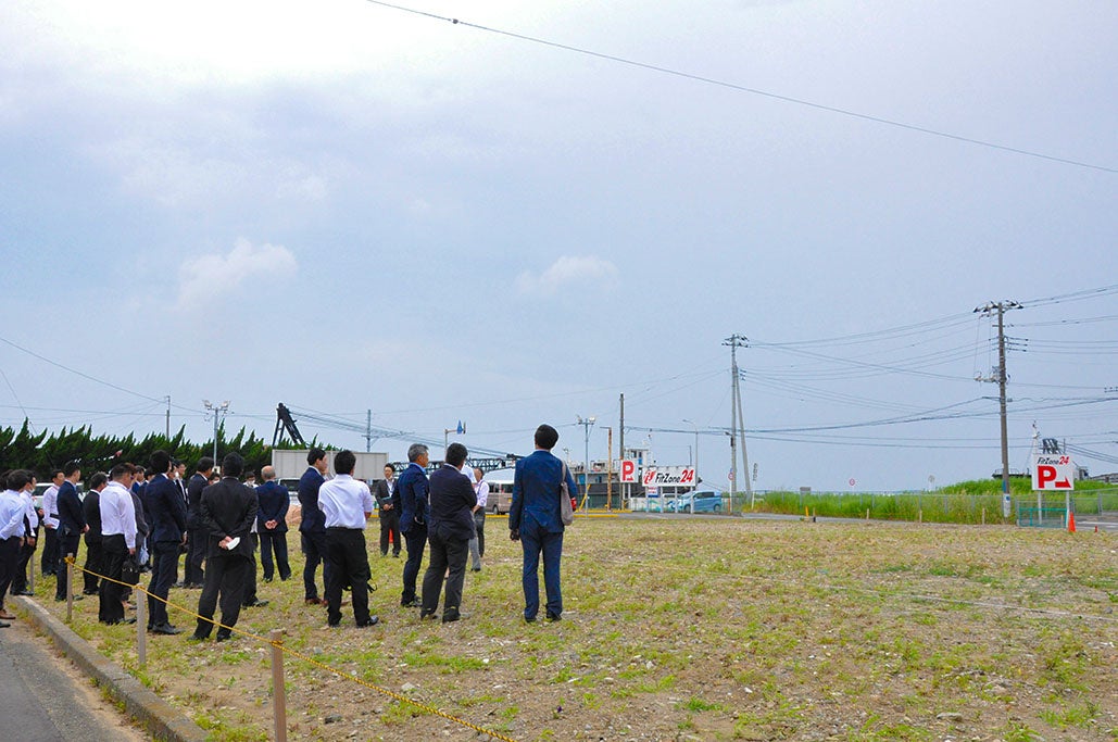 当日は当グループ会長・井坂泰志、社長・梅田真理子をはじめとする弊社関係者が参加したほか、木更津市長、その他金融機関関係者、建設事業関係者にご来賓いただき、木更津中央三丁目の土地を視察いただきました。