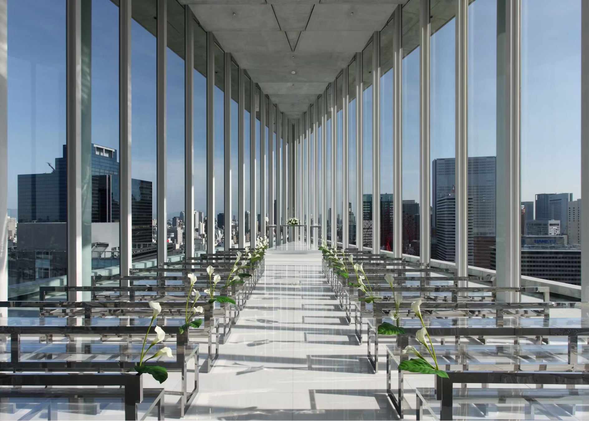 最上階23階には世界的建築家の安藤忠雄氏設計の天空のチャペル「チャペル ド シエル」。三角形の空間は船をイメージしており、全面ガラス張りで海に見立てた天空との一体感が味わえます。結婚式だけでなく見学も可能です。