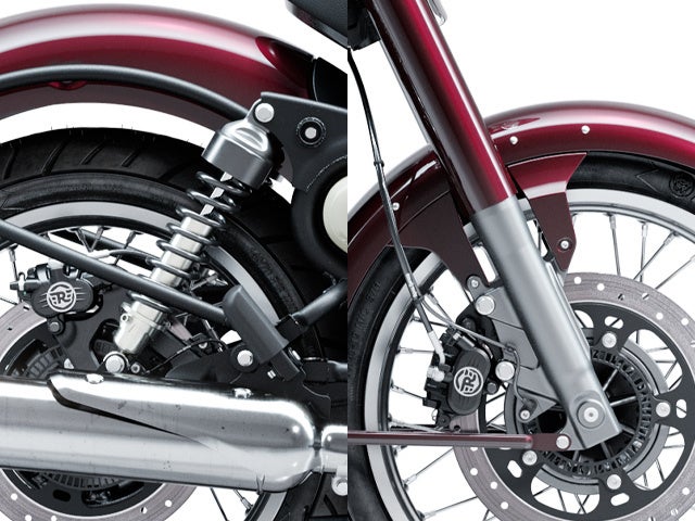 タイヤサイズ:フロント 100/90-19、リア 140/70 R18 フロントブレーキ:直径320mmシングルディスク+ツインピストン・ブレーキキャリパー リアブレーキ:直径300mmシングルディスク+ツインピストン・ブレーキキャリパー ABS:デュアルチャンネルABS |