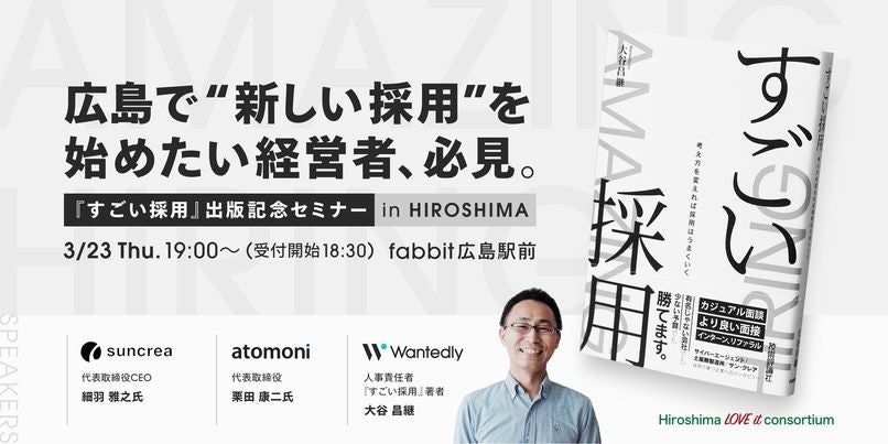 株式会社 サン・クレア(所在地:広島県福山市、以下サン・クレア)代表取締役CEO:細羽雅之は、ビジネスSNS「Wantedly」を運営するウォンテッドリー株式会社(所在地:東京都港区、代表取締役:仲 暁子、以下ウォンテッドリー)がひろしま好きじゃけんコンソーシアム(所在地:広島県東広島市)と共催する、 “新しい採用”手法を指南するセミナー【書籍「すごい採用」著者登壇セミナー@広島】にてゲストスピーカーとして登壇いたします。本イベントは、ひろしま好きじゃけんコンソーシアムにとって、民間企業と実施する、初めての企業向け共催イベントです。