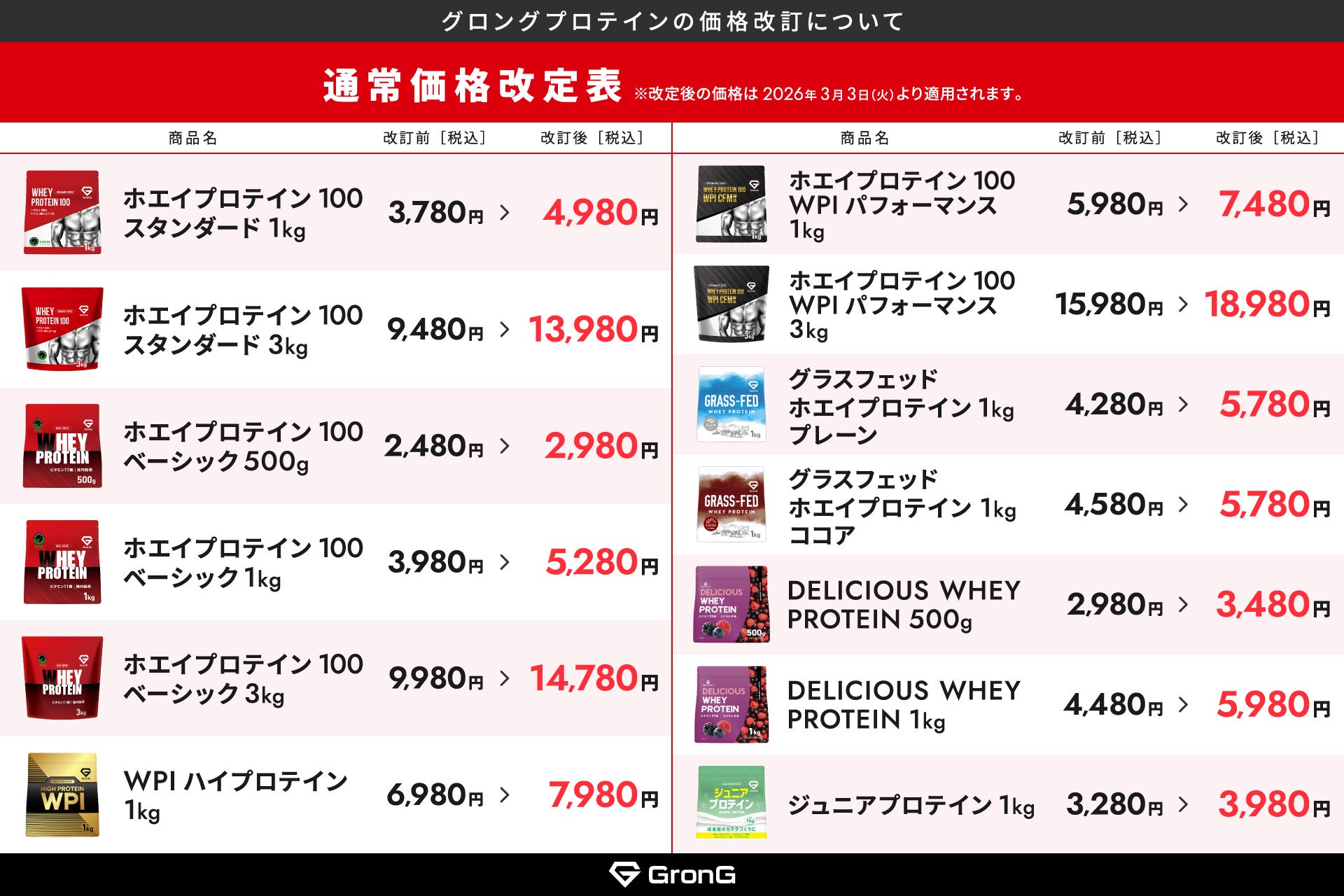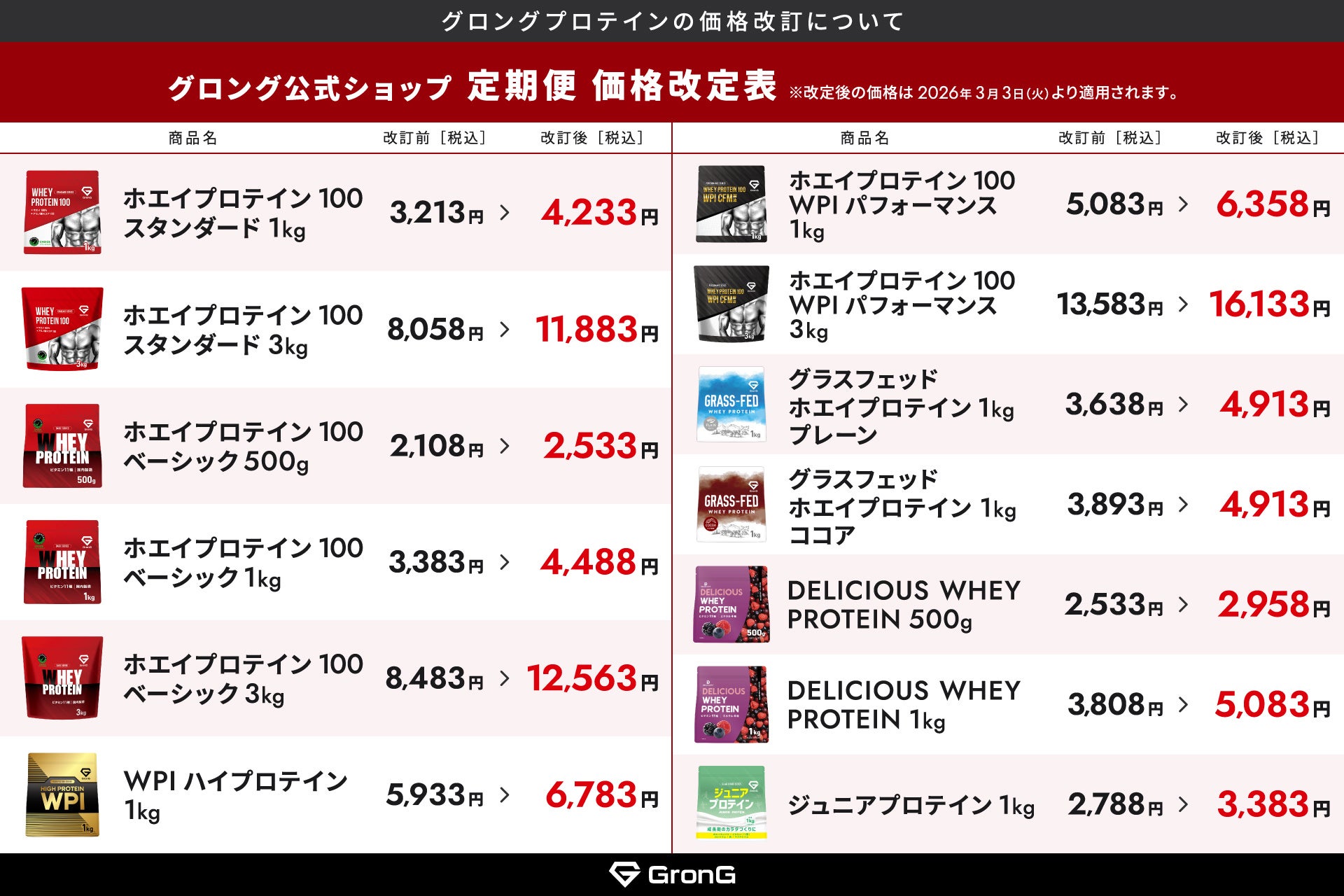 サプリメントやトレーニング器具の販売などをおこなう株式会社Ultimate Life(本社:大阪市東成区、代表取締役社長:田中 悠貴)は、2026年3月3日(火)に一部ホエイプロテイン商品の価格を表の通り改定します。