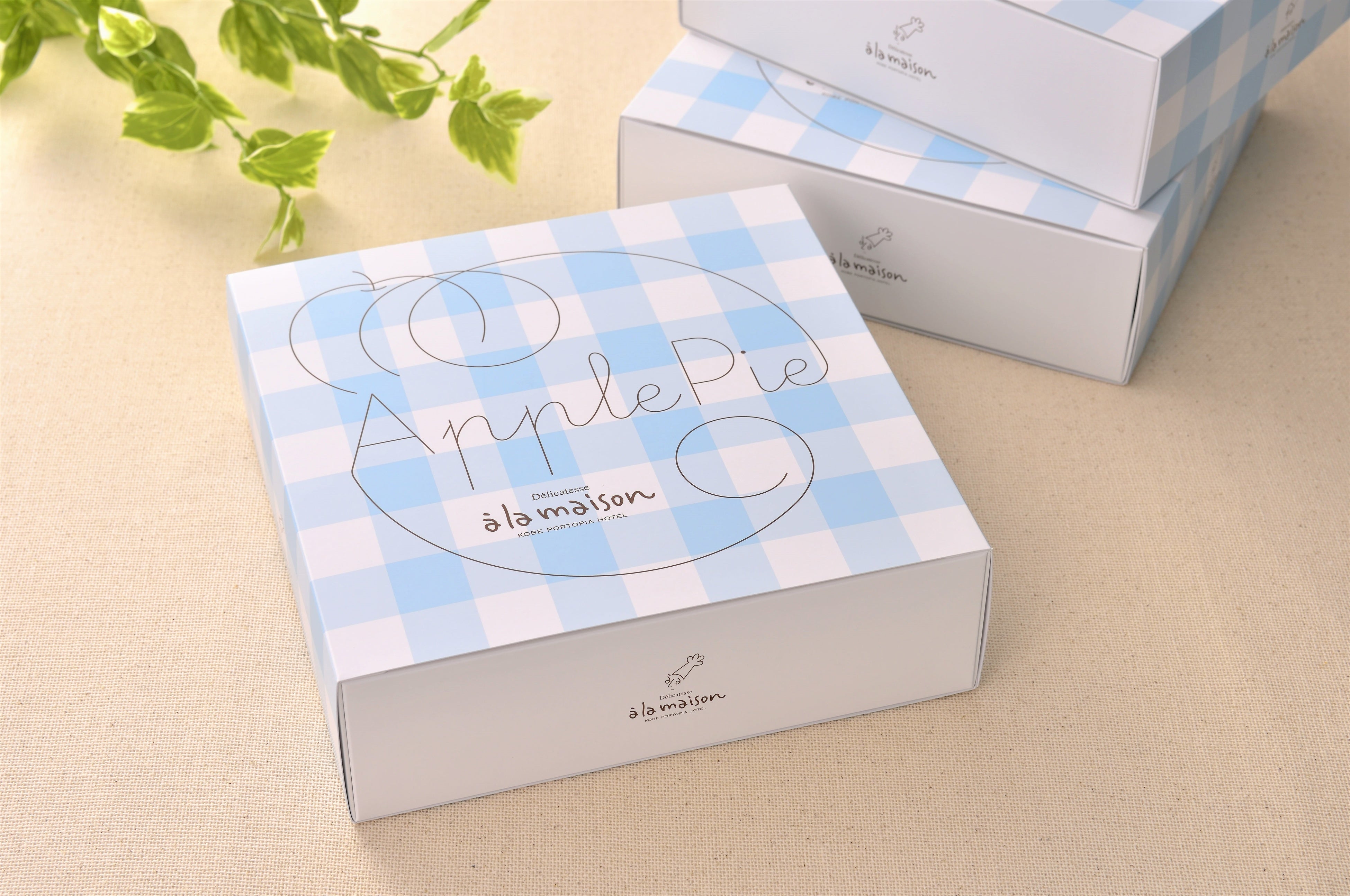 海辺に吹く爽やかな風と、異国情緒溢れる洗練された神戸の街並みを感じていただくよう、ブルーを基調にしたかわいいギンガムチェック柄。箱の前面にはりんごを模した一筆書きのデザインでApple Pieの文字が描かれています。