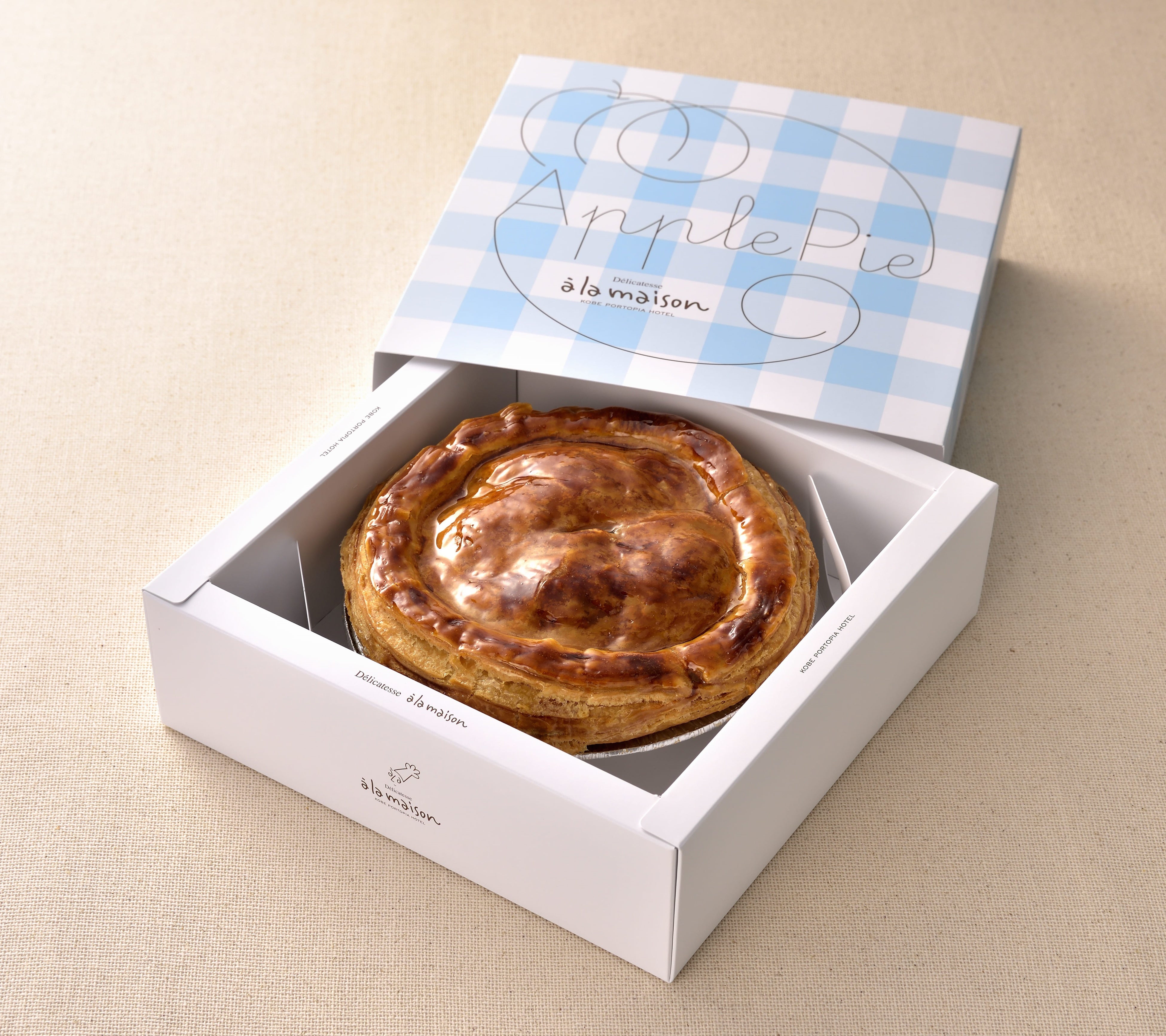 ポートピアホテルは、ホテル名物料理「アップルパイ」をリニューアルいたしました。異国情緒溢れる神戸の街並みをイメージし、ブルーを基調にしたギンガムチェック柄のパッケージとともにお届けします。