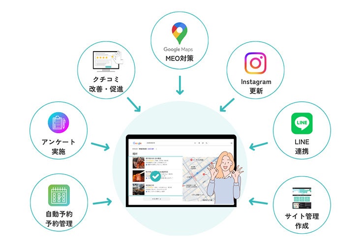 Googleマップ対策、24時間予約可能なWeb予約、顧客ニーズを明確化するためのアンケート、クチコミ促進、簡単なWebサイト制作ツールなど、店舗運営に必要な機能を統合したプラットフォームです。
