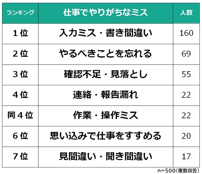 【仕事でやりがちなミスランキング】男女500人アンケート調査