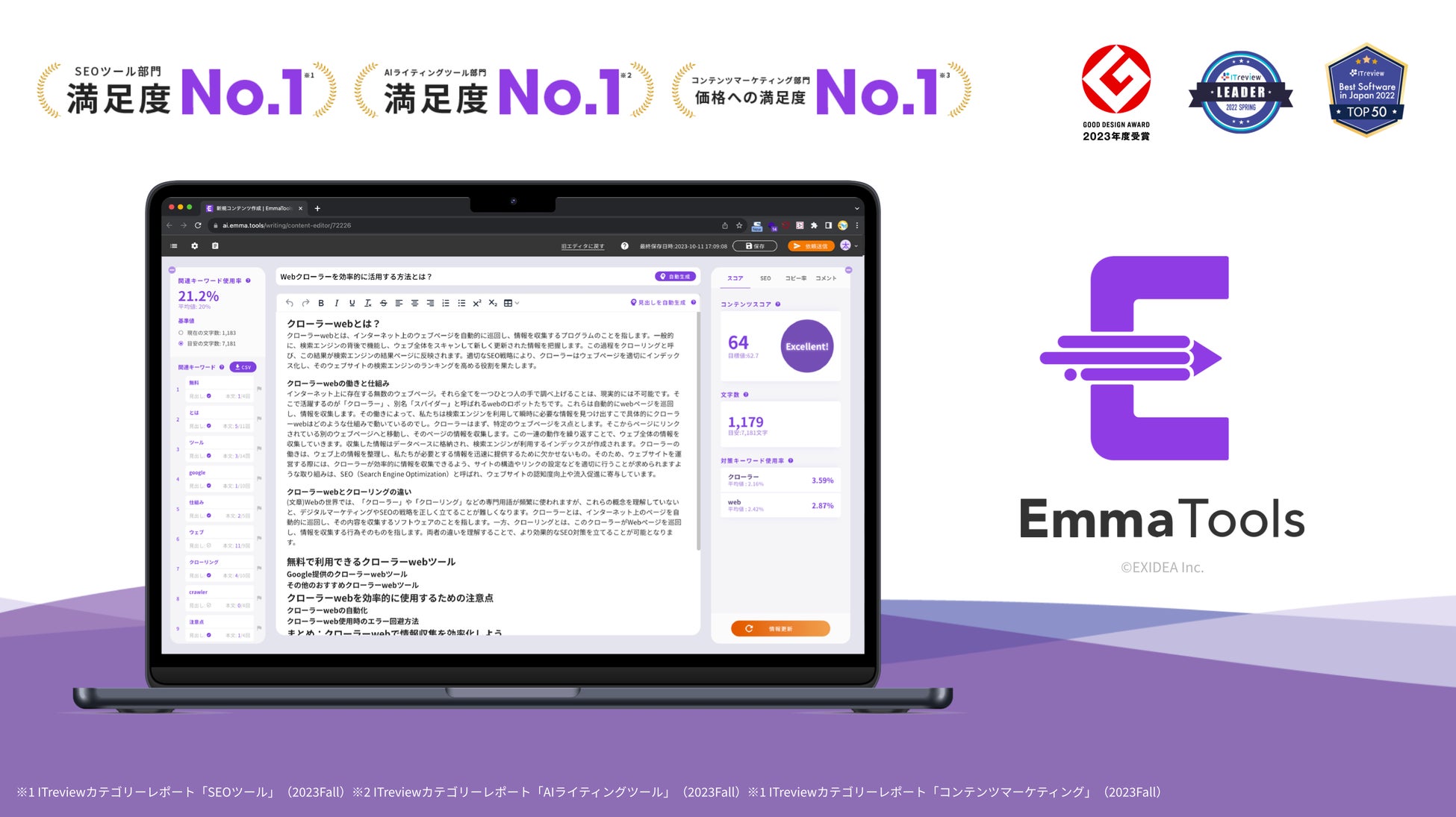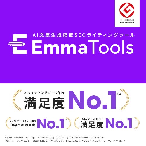 EmmaToolsは「2023 年度グッドデザイン賞」やITreviewの「満足度No.1」(※)などを受賞しており、数多くのお客様への貢献を目指しています。