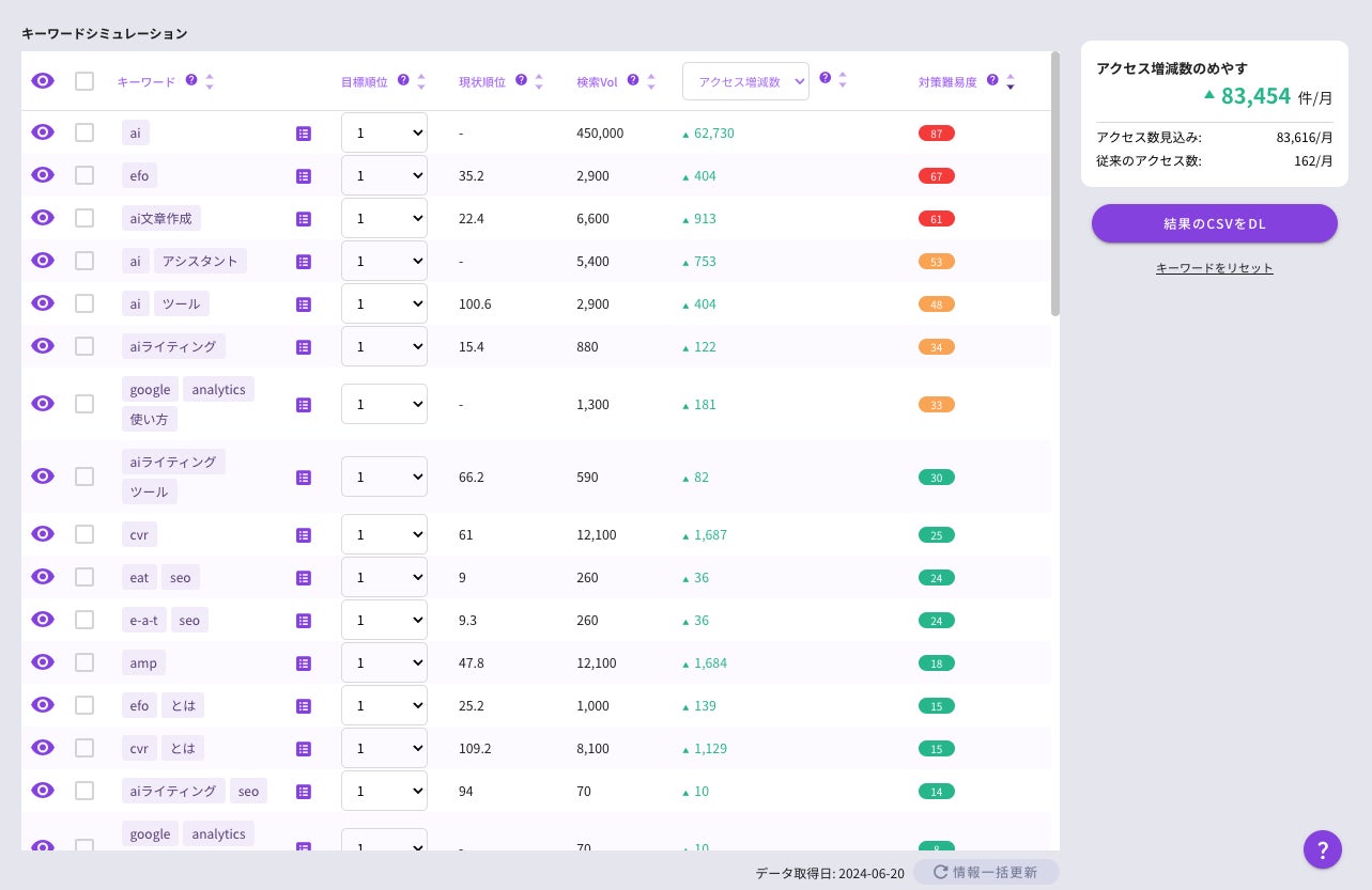 新たにリリースされたキーワードシミュレーション機能は、ユーザーが選定したキーワードの検索ボリュームや競合状況、難易度および予測流入数を提供します。この機能により、ユーザーはターゲットキーワードの選定にかかる時間を大幅に短縮でき、より戦略的なSEO対策を実施できます。
