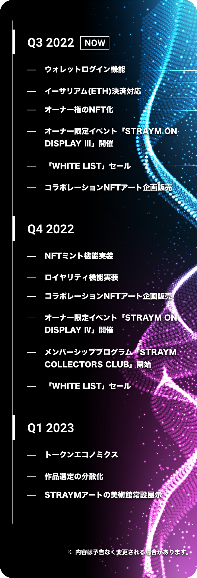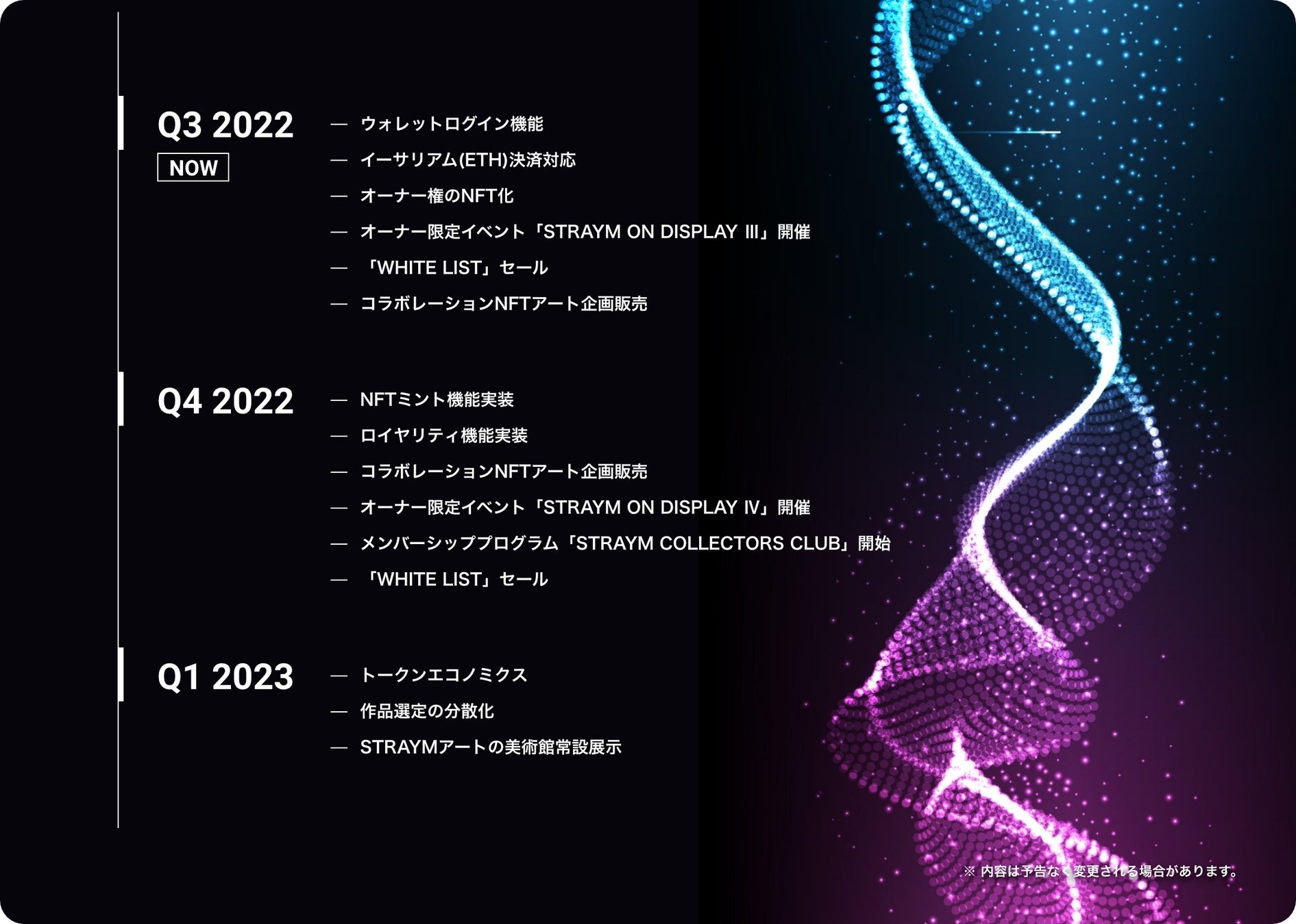 ストレイムは今後のサービスアップデートを通じてユーザー体験を向上し、上記のようなアートの保有にとどまらない新しい楽しみ方を体験していただくべくロードマップに則り、現在開発を進めております。