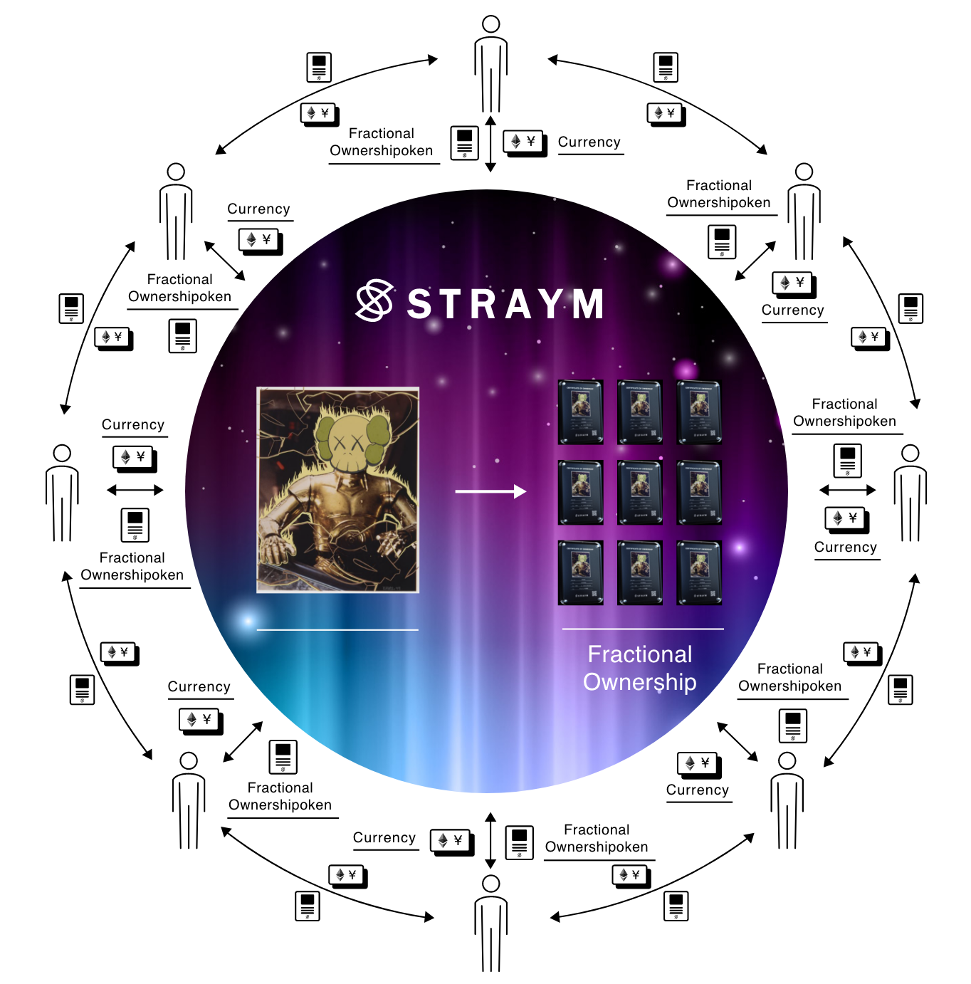 その中で、ストレイムはブロックチェーンをアートに応用した「アートの分散型保有」により、アートの楽しみ方そのものをアップデートします。例えば、アートの分割保有権を「オーナー権NFT」としてブロックチェーン上で分散することにより、改ざん耐性が向上することに加え、これまで以上にアートの分割保有を客観的に担保できるようになります。また、オーナー権NFTは保有することによって、アートコミュニティ「STRAYM COLLECTORS CLUB」に参加するための会員権として機能し、アートオーナー同士がアート体験を共有することができます。