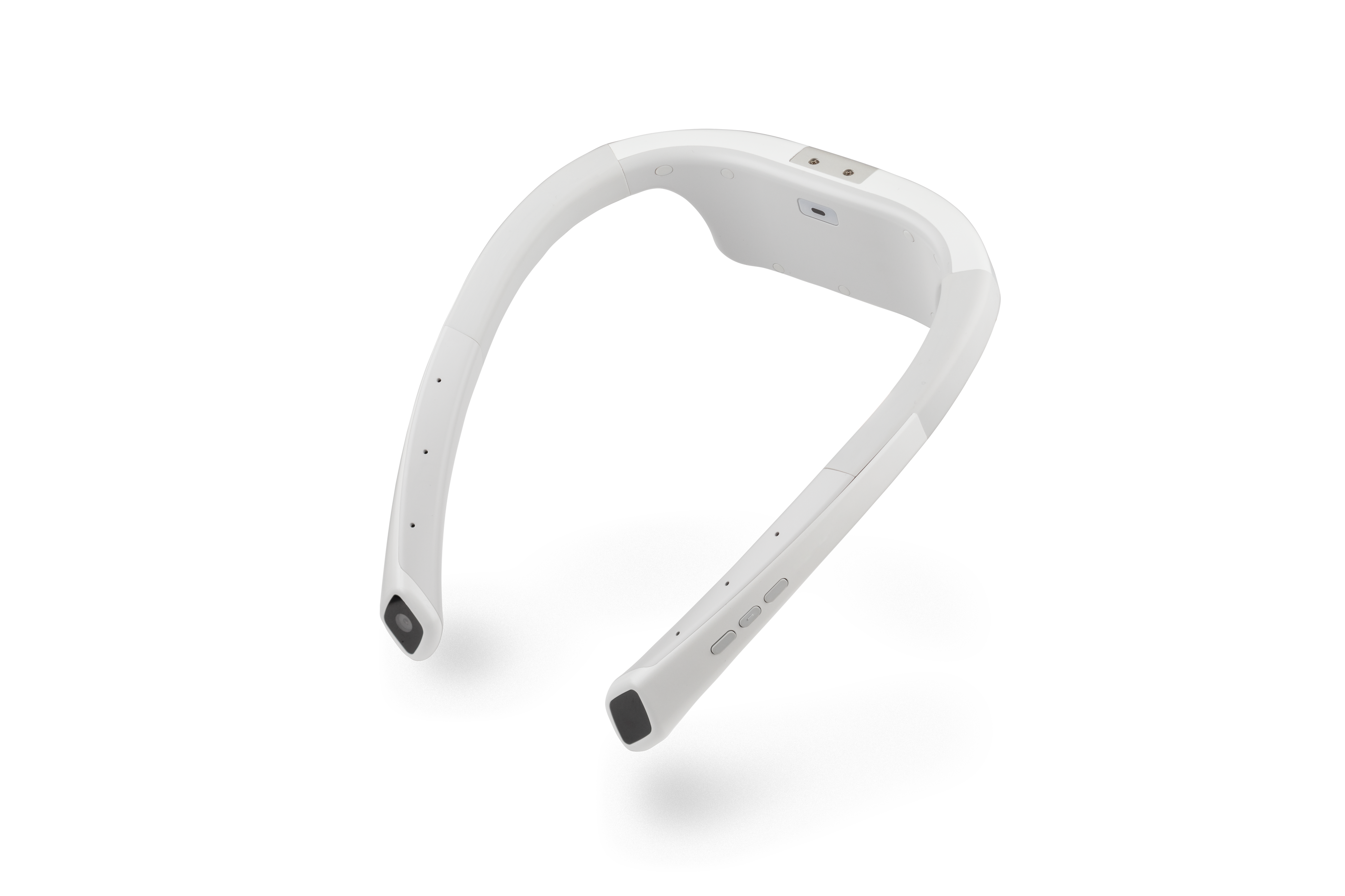「THINKLET」は、臨場感のある一人称映像を手軽に撮影できる首掛け型のウェアラブルデバイスです。ヘッドマウント型と比べて装着負荷が少なく、装着者が長時間使用しやすく、安定した映像を収録しやすい設計となっています。また、誰でも自由にアプリを開発してTHINKLETを拡張できるよう、開発者ポータルを用意しております。
