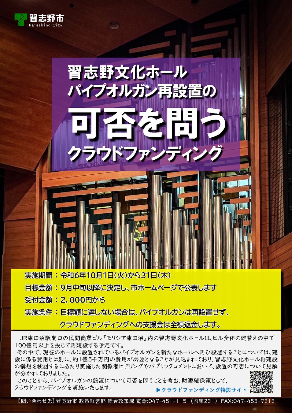 【千葉県習志野市】"可否を問う"クラウドファンディング 10月実施が決定! 〜習志野文化ホールパイプオルガン再設置〜