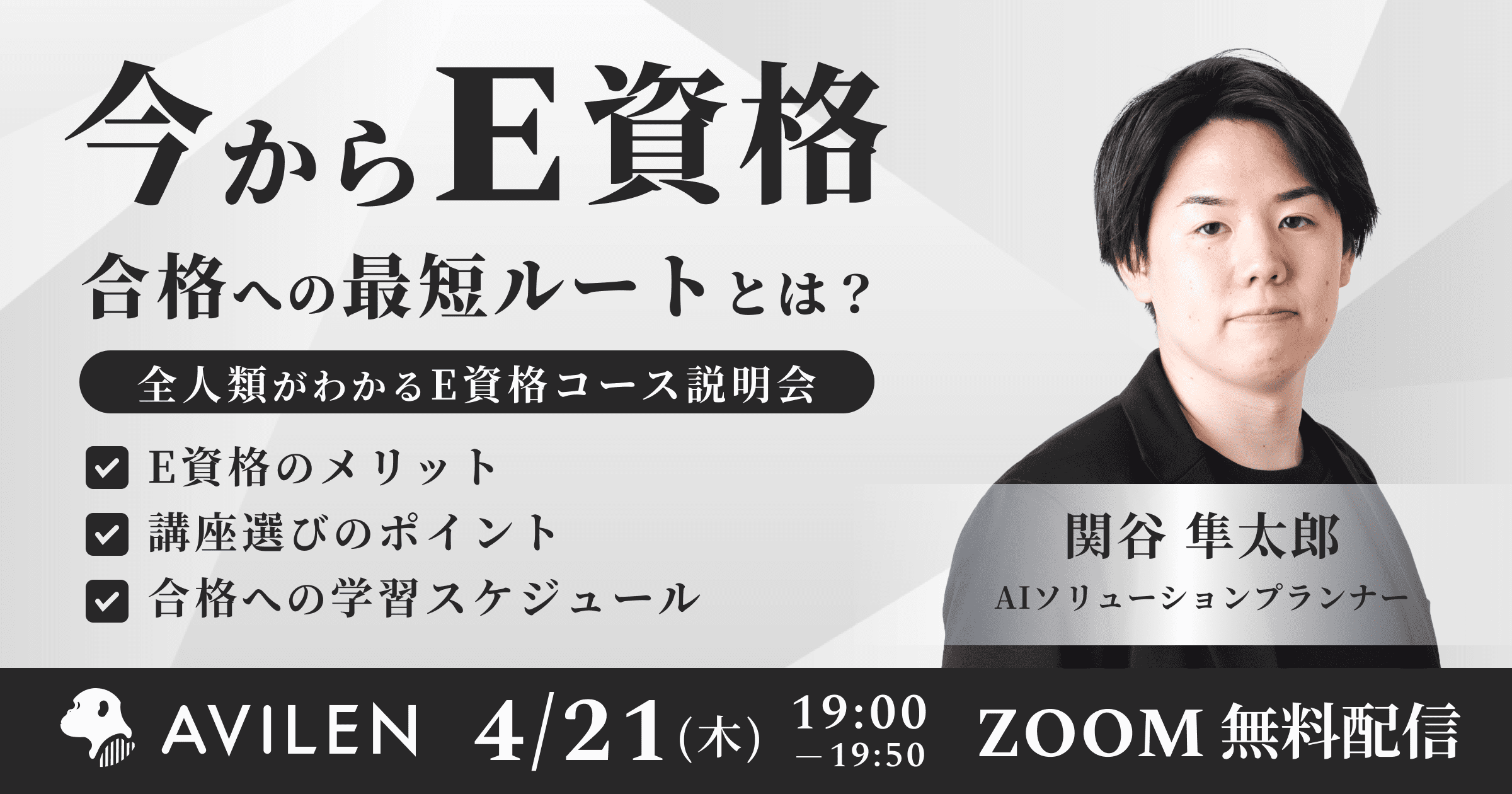 今回は、AVILENのE資格コースのご紹介に加えて、E資格取得のメリットや、JDLA認定プログラムの選定ポイント、今から2022#2、2023#1をターゲットにした学習スケジュール等についてお話する予定です。