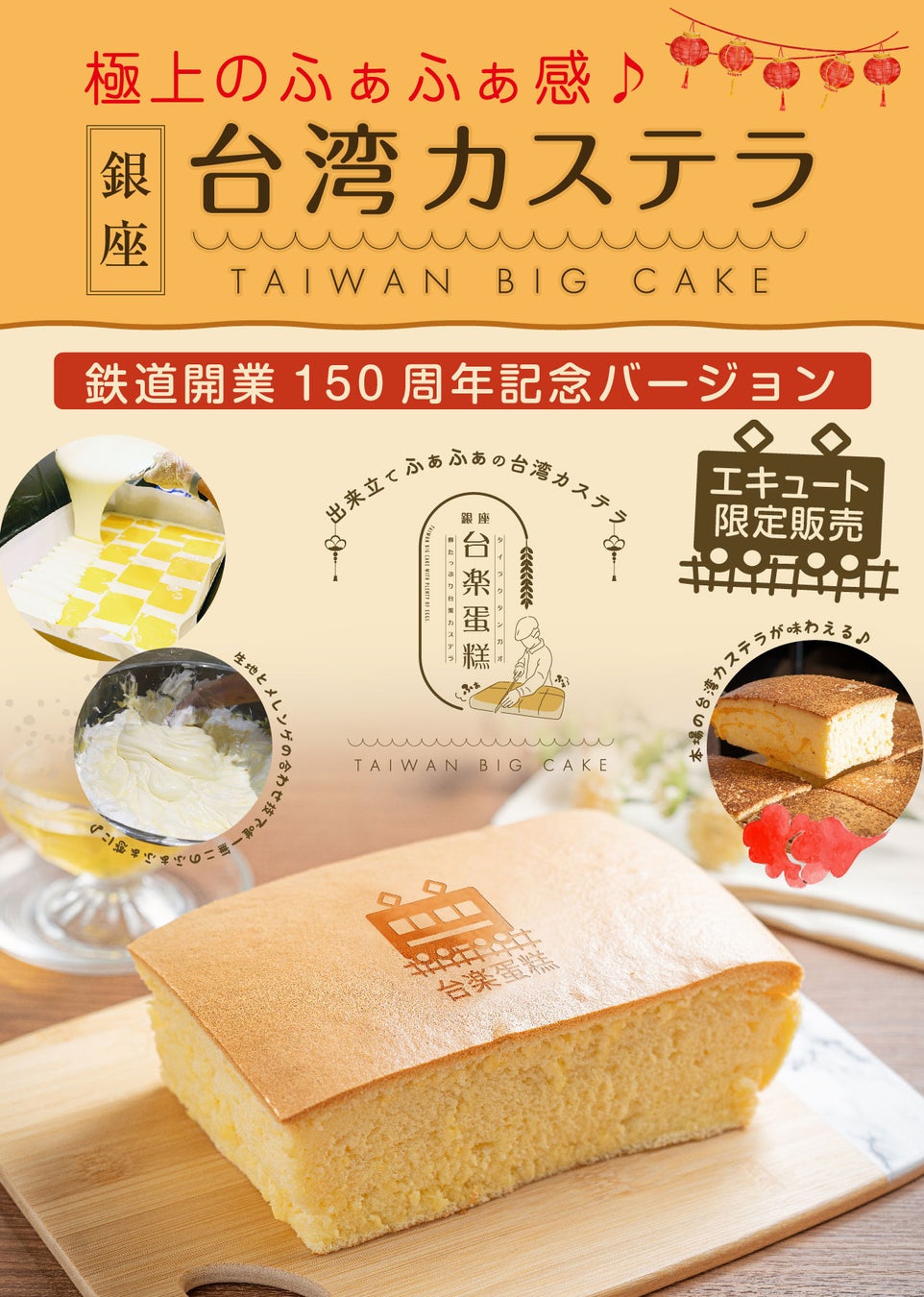 銀座本店や各地催事出店で大人気の台湾の製法をそのまま取り入れ、現地の味と食感を再現した人気の台湾カステラのフレーバー各種を販売します。今年は、鉄道開業150周年に当たり、これを記念して、鉄道のイラストが入った焼き印を押したカステラを数量限定で用意しました。ここでしか買えない特別デザインです。また、いろいろな味を試したい方へお勧めの1箱に2種や4種の味が入った欲張りなセット、カステラに合う台湾茶や紅茶の販売も行います。