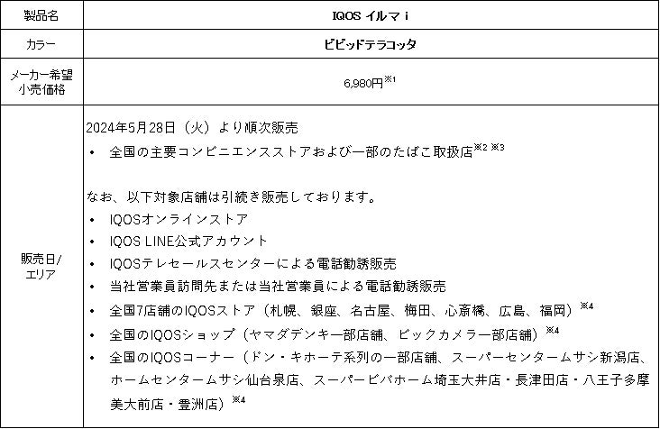 フィリップ モリス ジャパン合同会社(本社:東京都千代田区、社長:シェリー・ゴー、以下「PMJ」)は、2024年3月13日(木)より、IQOS オンラインストア、IQOS LINE公式アカウント、IQOSテレセールスセンターによる電話勧誘、および全国7店舗のIQOSストア※、IQOSショップ(ヤマダデンキ一部店舗、ビックカメラ一部店舗)、IQOSコーナー(ドン・キホーテ系列の一部店舗他)などで販売していた、新型加熱式たばこ「IQOS イルマ i」の人気カラー「ビビッドテラコッタ」を、2024年5月28日(火)より、全国の主要コンビニエンスストアおよび一部のたばこ取扱店にて数量限定で順次販売いたします。