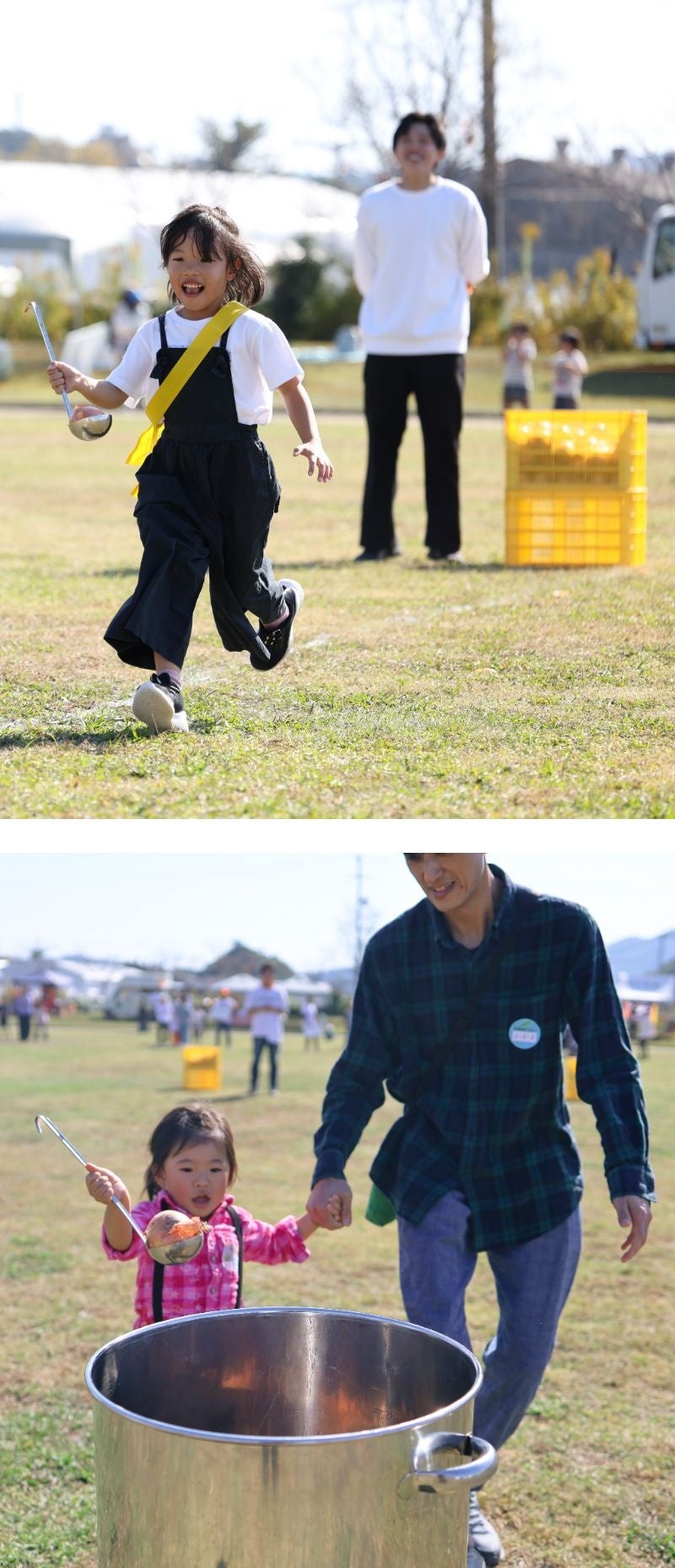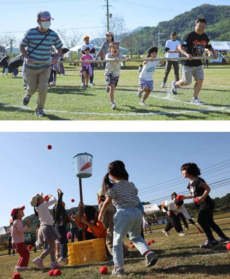 「お玉ねぎリレー競走」では、お玉に玉ねぎをのせて落とさないように慎重に運ぶ子どもたちの姿に“がんばれー”と声援が飛びました。