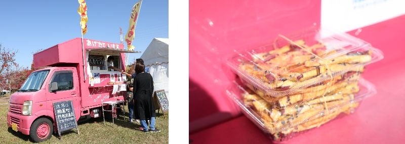 2022年にオープンした、揚げたてのいも天屋。可愛らしいピンクのキッチンカーで、芋けんぴやいも天が販売されました。甘いほくほくのお芋を買い求めて、長蛇の列ができました。