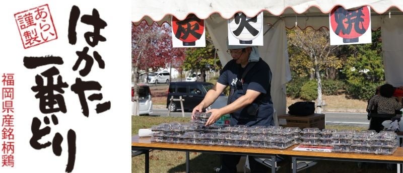 福岡県を代表する銘柄鶏「はかた一番どり」を扱う卸売会社。「はかた一番どり」は、一般的な鶏肉に比べ、旨味成分が約15%も多いのが特徴です。当日は、若鶏を使用したやわらかくてジューシーな炭火焼きを販売していただき、大好評でした。