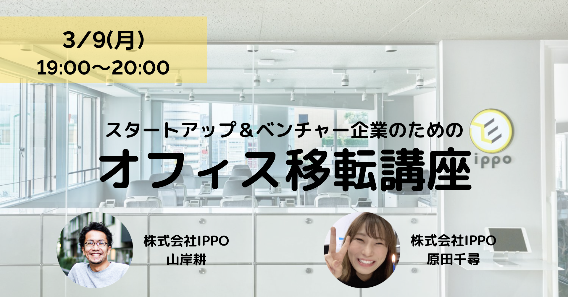 本イベントでは、スタートアップ・ベンチャー企業のオフィス仲介を多数行う株式会社IPPOが、スタートアップ・ベンチャー企業向けのオフィス移転に関する基礎知識を1時間でお伝えします。