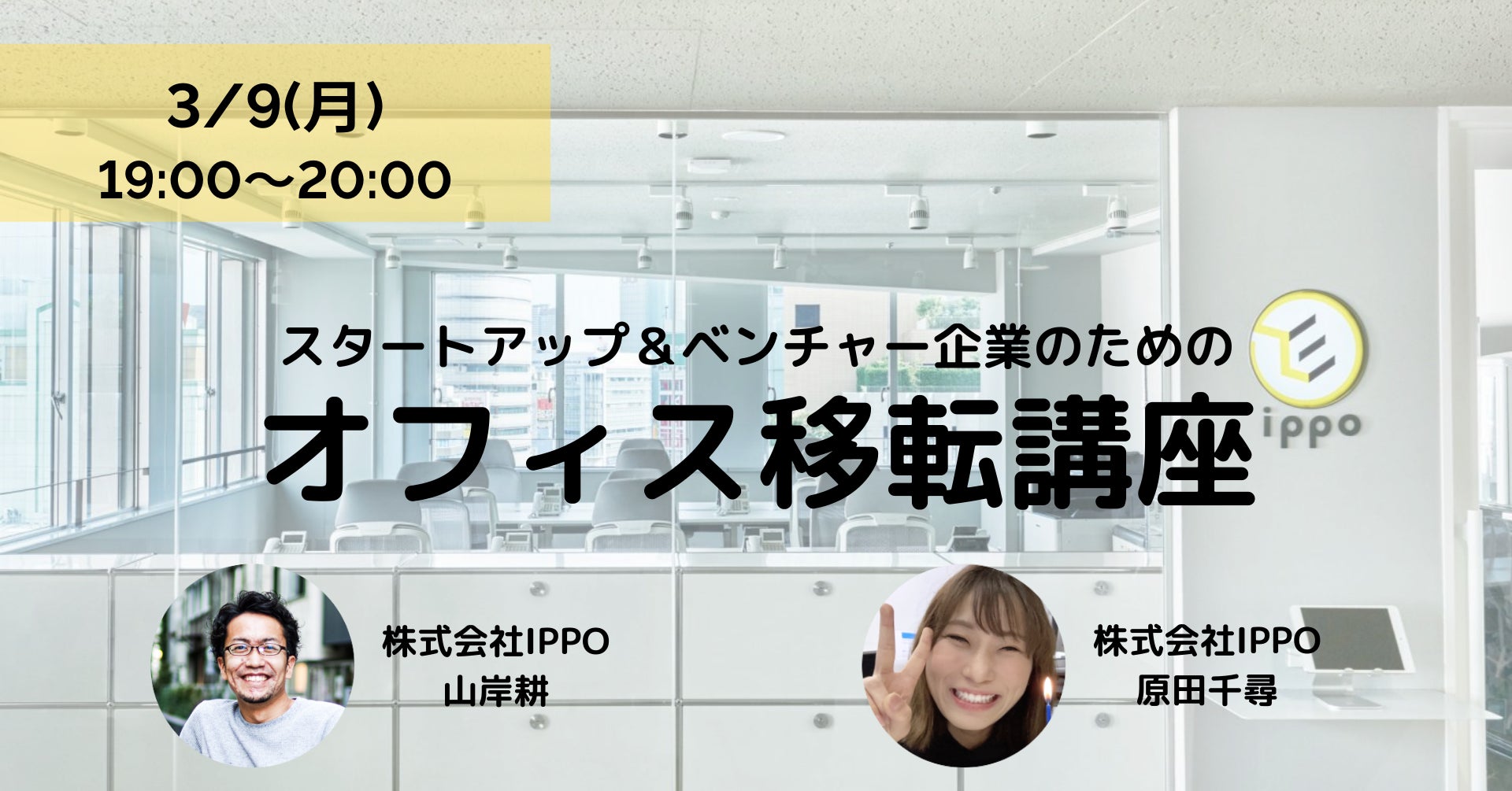 スタートアップ・ベンチャー企業に特化したオフィス仲介業務と不動産サービスを展開する株式会社IPPO(東京都渋谷区 代表取締役社長:関口秀人 以下IPPO)は、2022年3月9日(水)に『スタートアップ&ベンチャー企業のためのオフィス移転講座』としてオンラインセミナーを開催いたします。