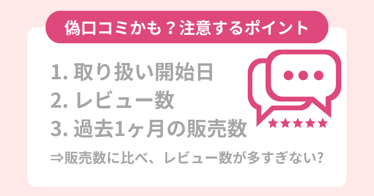 そのため、販売数に対して、レビュー数が異常に多い場合、サクラが含まれている可能性が高いです。
