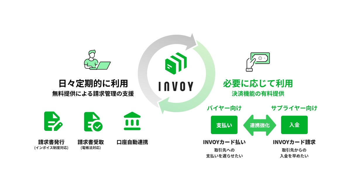2022年からは、BtoB向けカード決済サービス「INVOYカード払い」「INVOYカード請求」や「請求書のデータ化」といった決済関連機能の強化に注力してきました。これによりINVOYは、日々の請求・支払管理や決済、資金繰りまで、事業の入出金に関する手続きがワンストップで行えるプラットフォームとして進化しています。