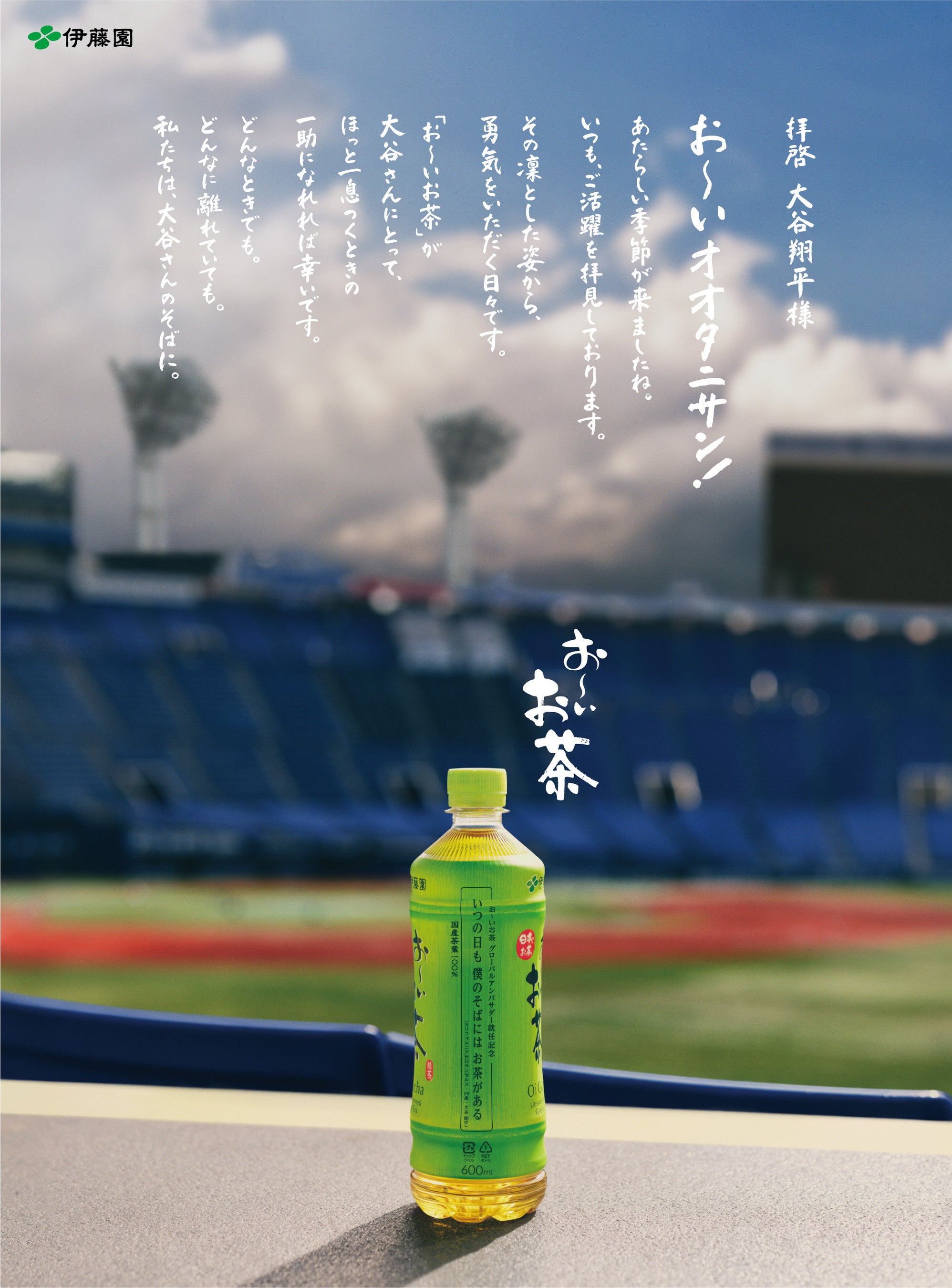 日本全国&世界60紙以上の新聞の全面広告で、伊藤園から大谷選手へのエールを込めた”お手紙”を公開。大谷選手コメント「⽇本にいたときから『お〜いお茶』が⼤好きで、アメリカの⽣活でも⼤切な相棒です」